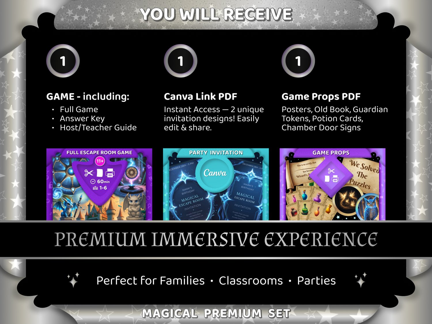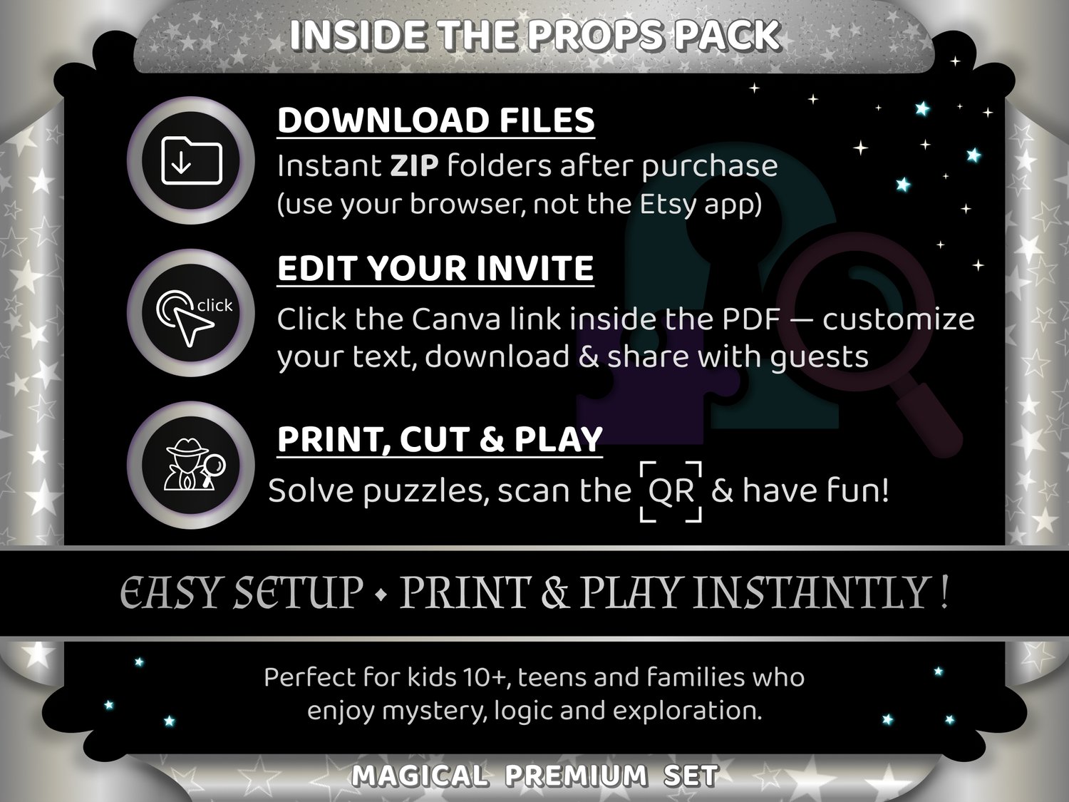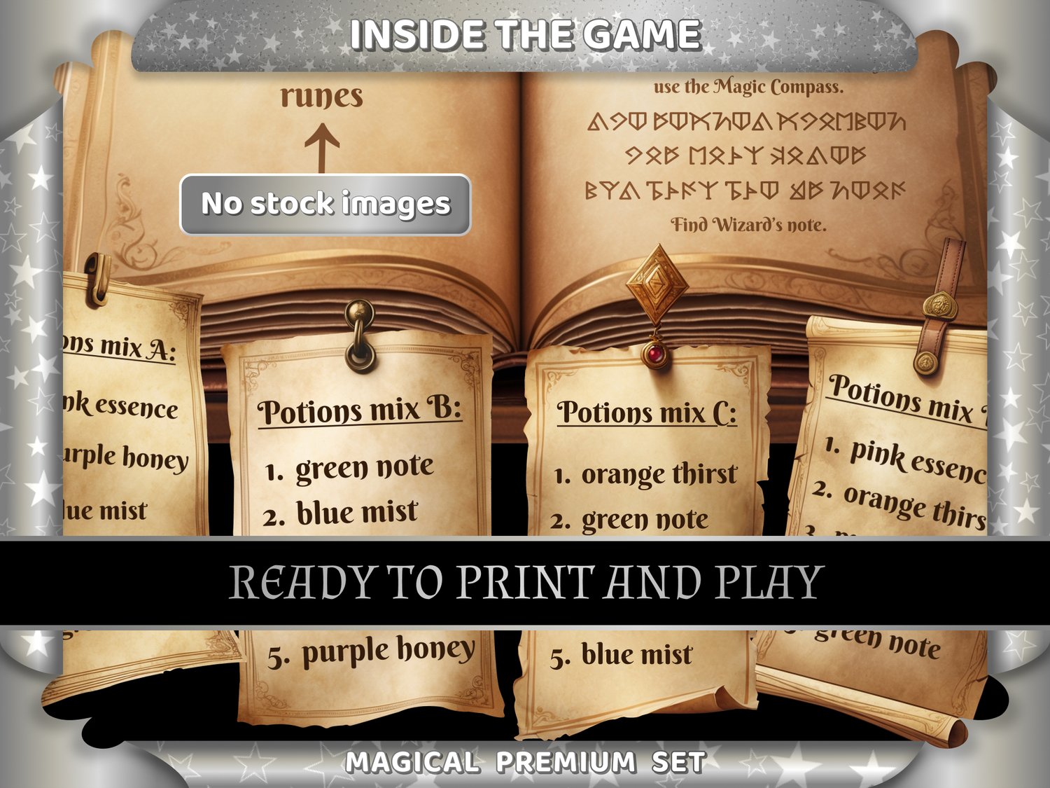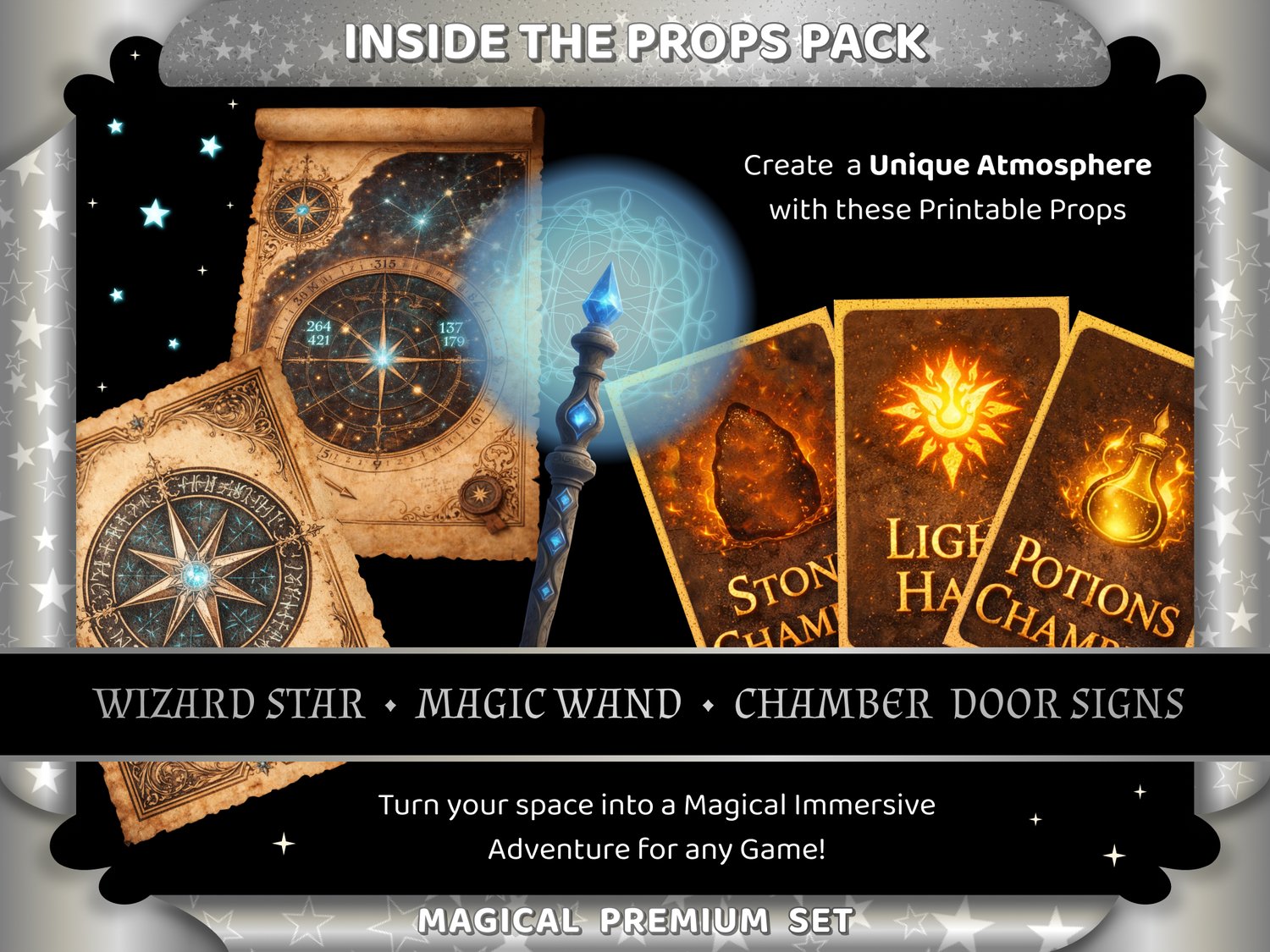 💼 Props add an extra layer of realism and immersion — perfect for parties, classroom plays, or family game nights. Players can use them as decorations, or bonus challenges for a true magical atmosphere. Props include a certificate and victory posters that can be used for group photos. Everything you need is included in the main game which is fully playable on its own — props are optional extras.