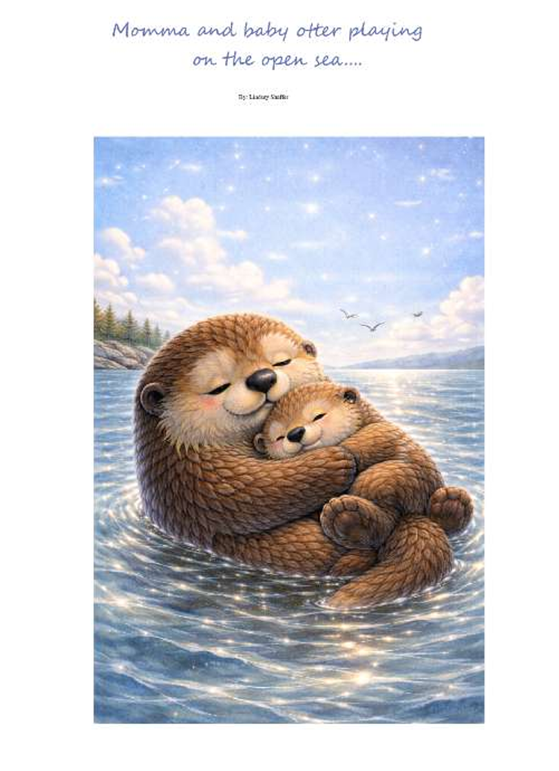 Out on the wide, open sea, where the water shimmers like glass and the sky stretches forever, a momma otter and her baby spend their day floating, playing, and dreaming together. Their story is a gentle journey through waves and moonlight, where tiny paws learn to splash, explore the forests of kelp below, and finally curl up safe and warm in Momma’s loving arms.
