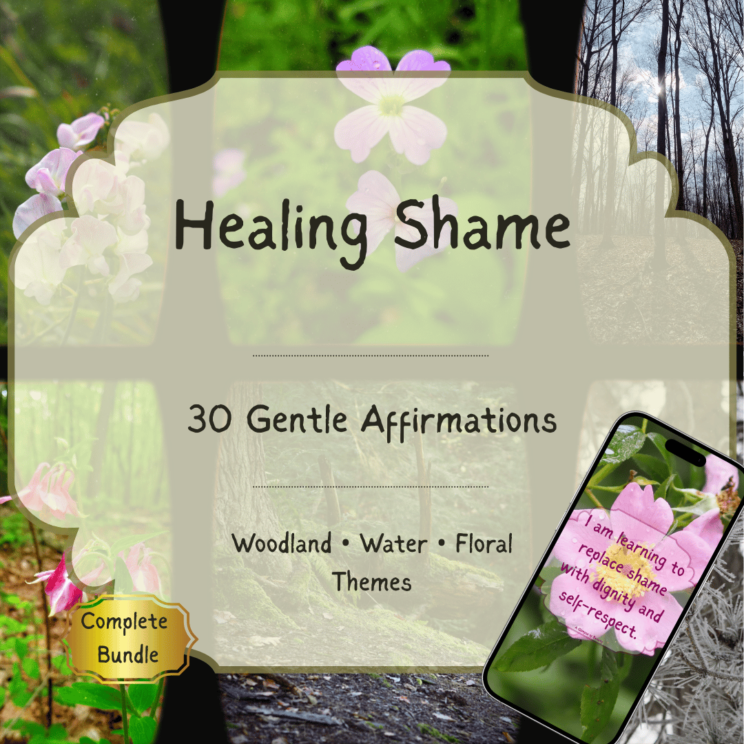This bundle includes three nature-inspired affirmation wallpaper collections created to support your journey with healing shame. Each collection pairs meaningful affirmations with peaceful nature photography, offering calming reminders you can carry with you throughout your day. With three visual themes — woodland, water, and flowers — you can choose the atmosphere that resonates with you most in the moment. Each theme offers a different emotional tone while supporting the same intention: encouraging compassion, reflection, and personal growth.