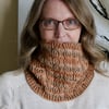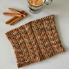 The cables winding up through this cowl look like curled sticks of cinnamon bark, especially in this beautiful colour of Malabrigo Rios. This one-skein cowl is perfect for any of those beautiful hand-dyed skeins of yarn, or any skein of yarn for that matter. Choose a worsted weight yarn in your favourite colour and enjoy the peaceful rhythm of working this beautifully textured combination of twisted ribbing and cable stitches for a thick and warm cowl.