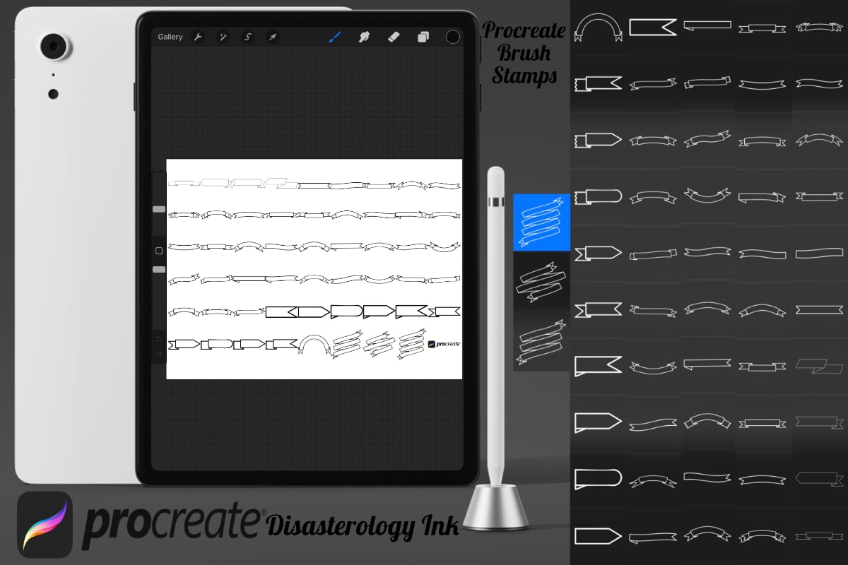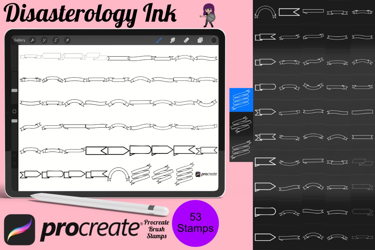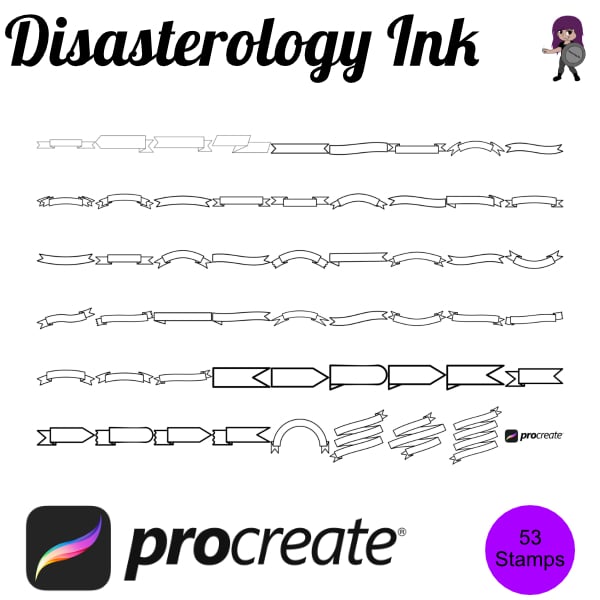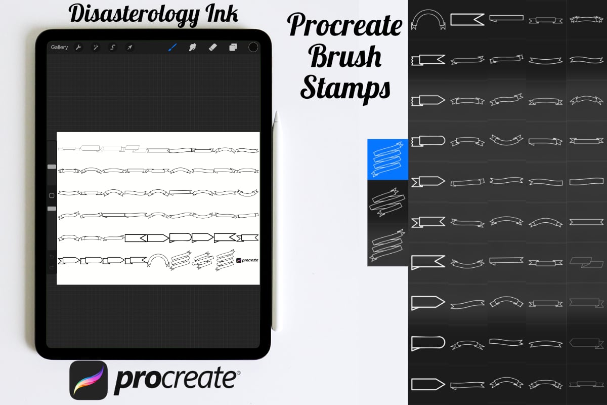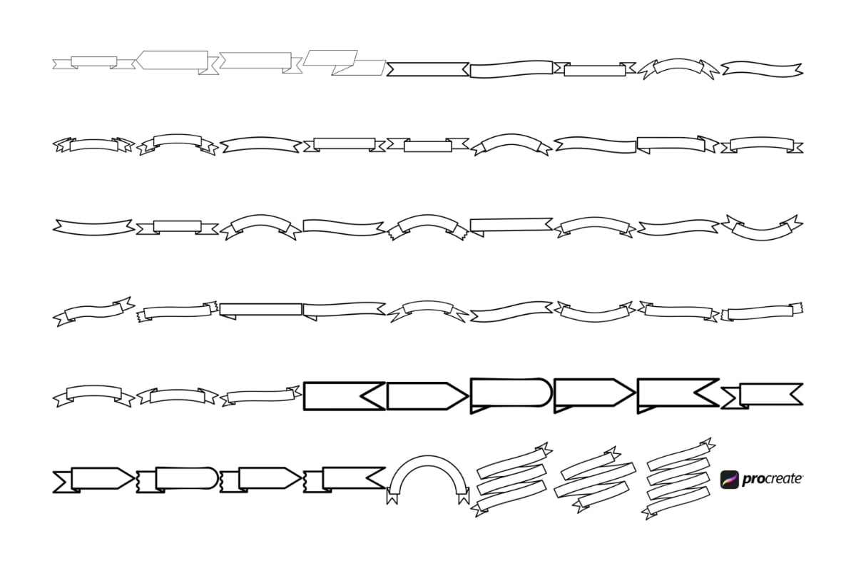 Procreate stamps save time when drawing, saving the effort of having to recreate the same thing for multiple designs and projects, save time on your design by purchasing these ribbon banner brush stamps so you can utilise that time on creating more beautiful art.