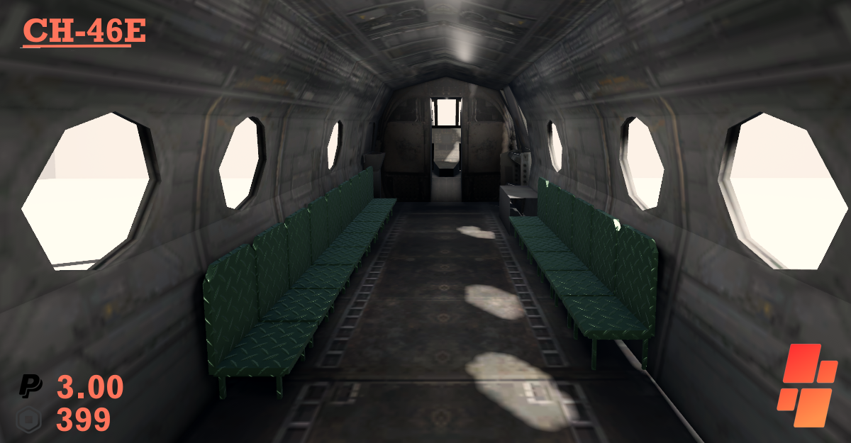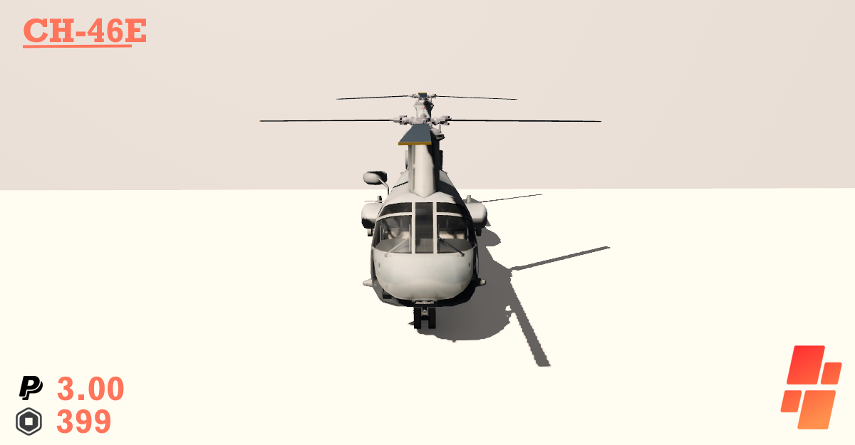 Description: The CH-46E, otherwise known as the "Sea Knight" is a medium-lift tandem-rotor transport helicopter able to carry up to 15 crew, and house two pilots. Powered by its dual rotors, this marvel of the skies is a must have for any fleet.