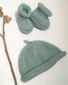 This hat and booties set will make the perfect handmade baby shower gift. Quick and easy to knit, they feature matching rolled edges. The hat has a spiral decreasing pattern in the crown and a cute little apple core. The booties have thick garter stitch soles for added warmth ribbed ankles to keep them on little feet.