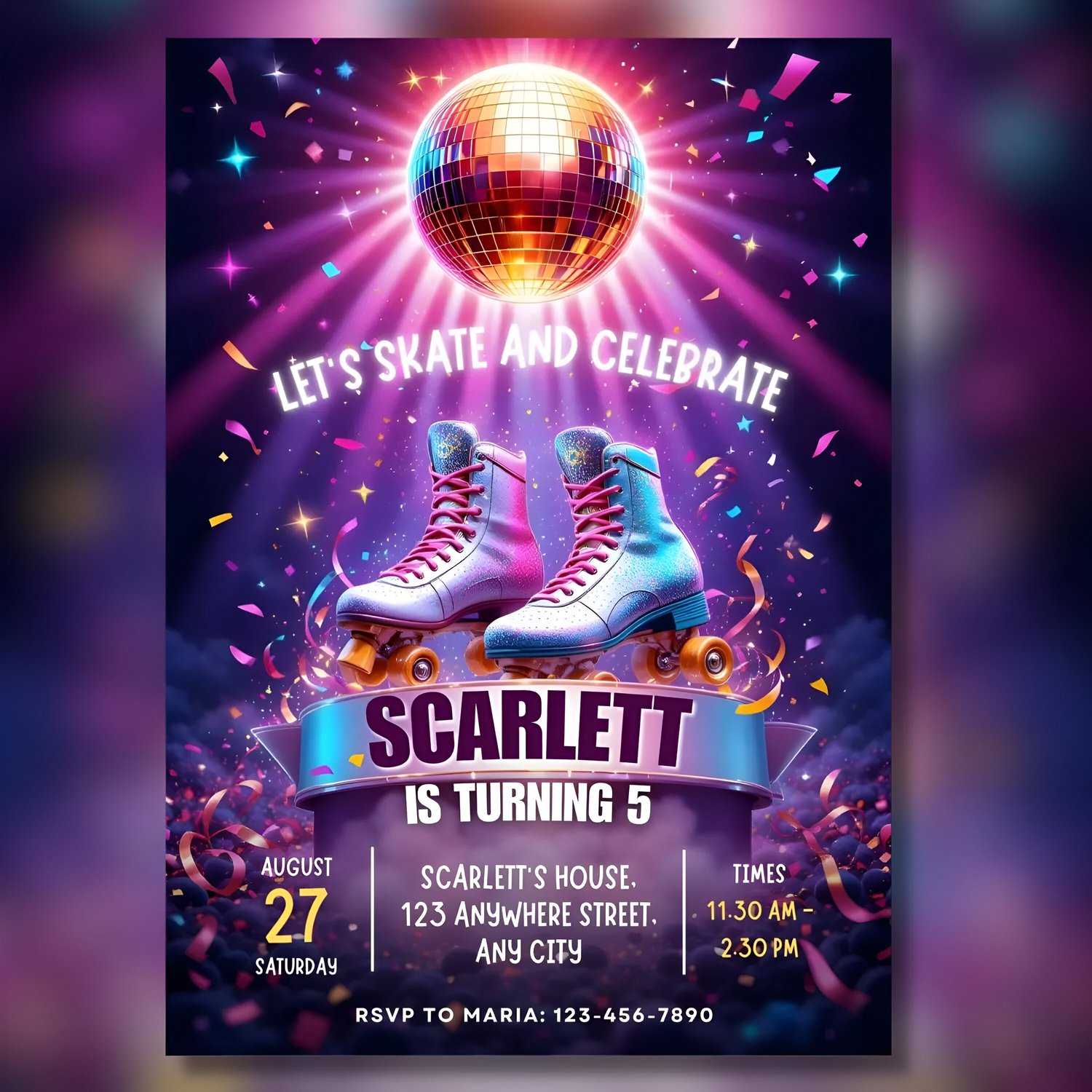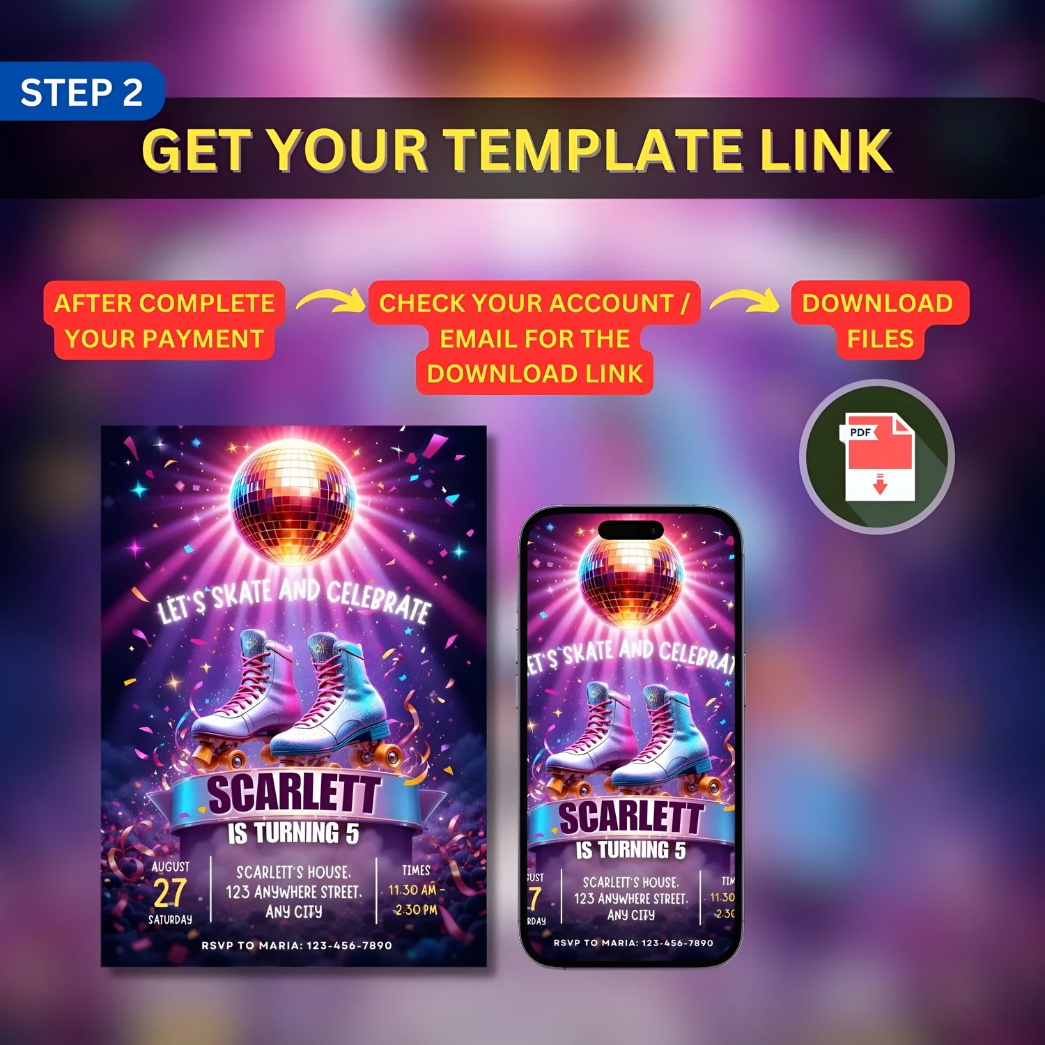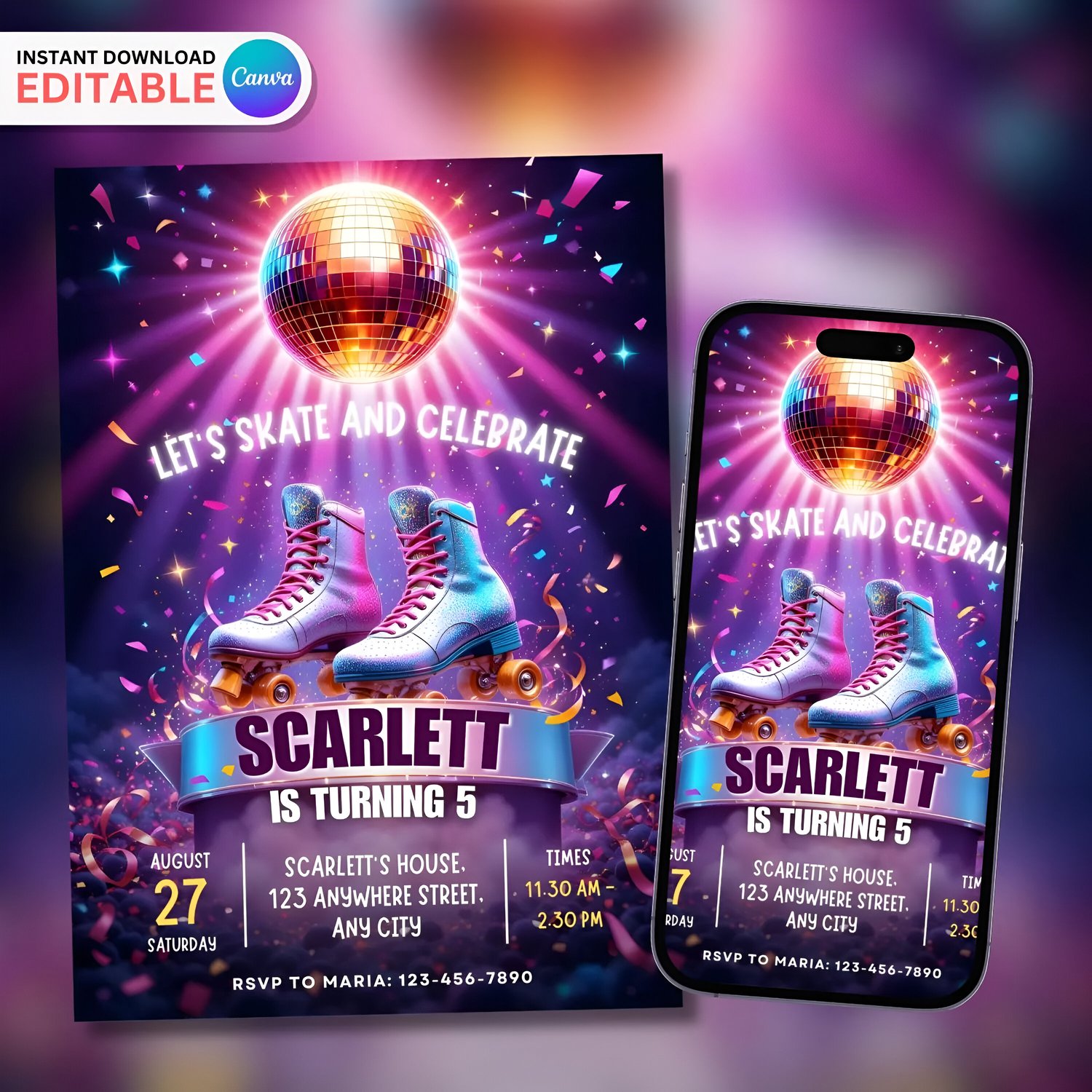 Roller disco party birthday invitation editable template, Rainbow glow roller skating birthday party invite, Roller skating party