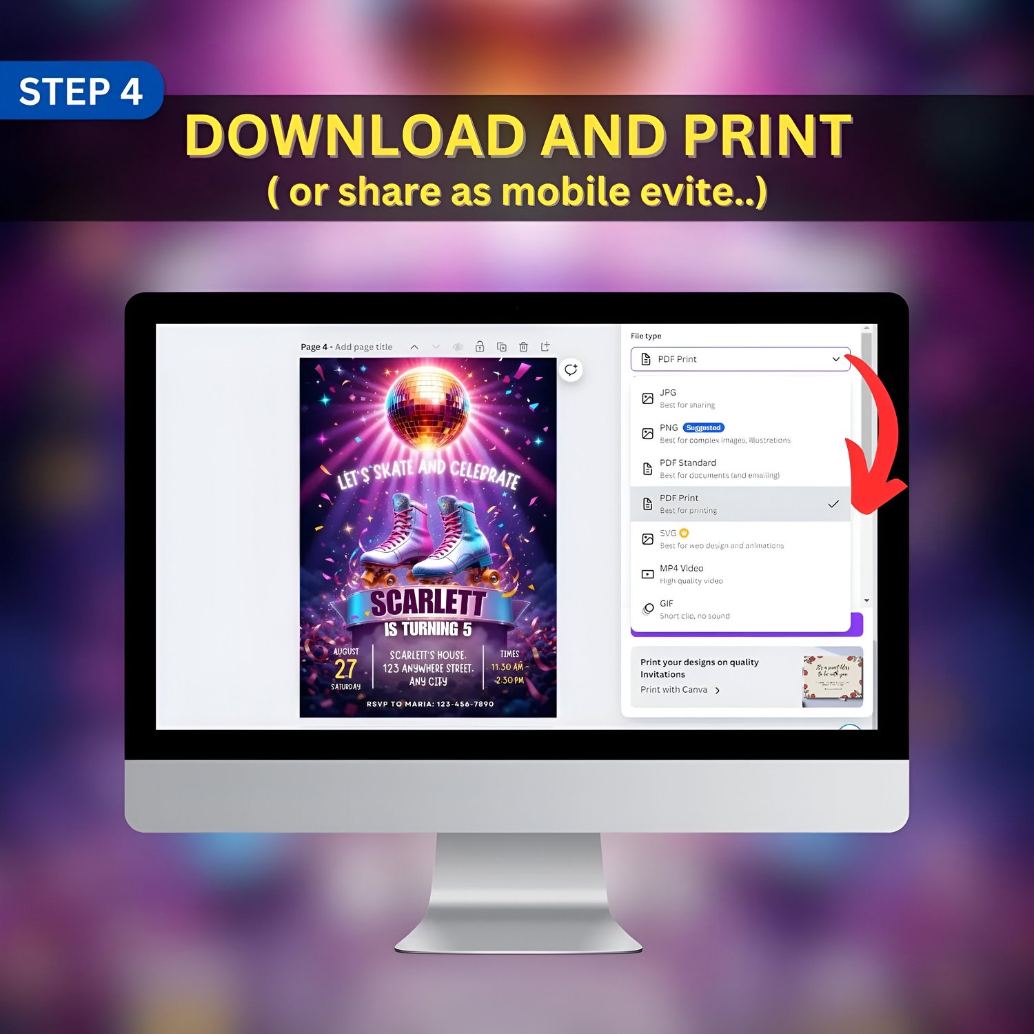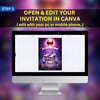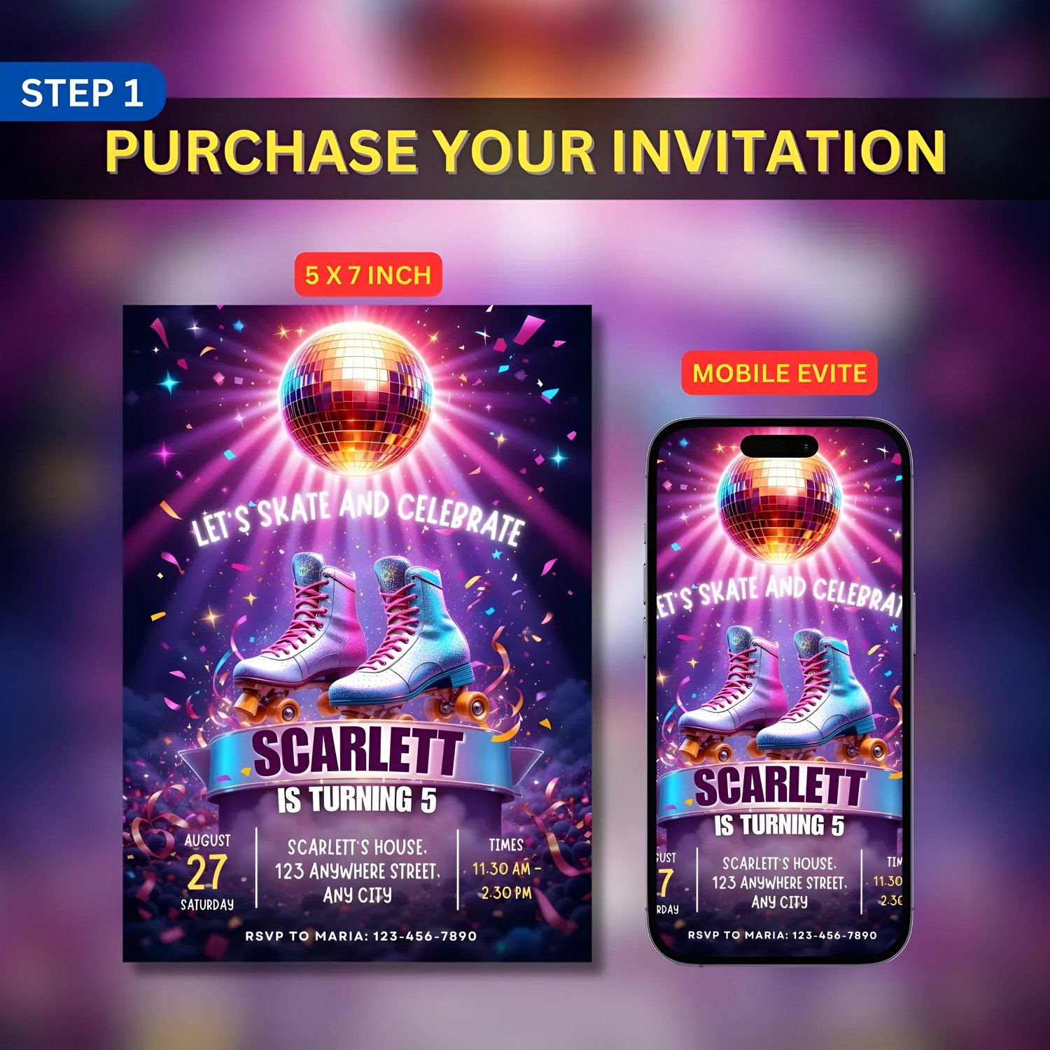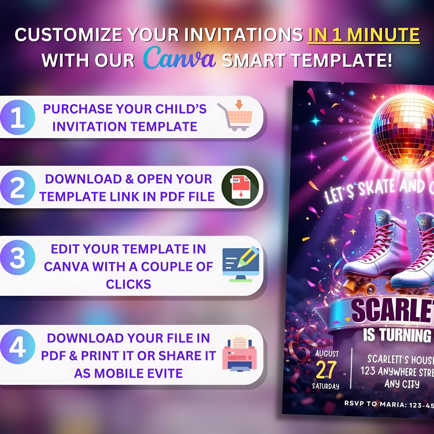 Roller disco party birthday invitation editable template, Rainbow glow roller skating birthday party invite, Roller skating party