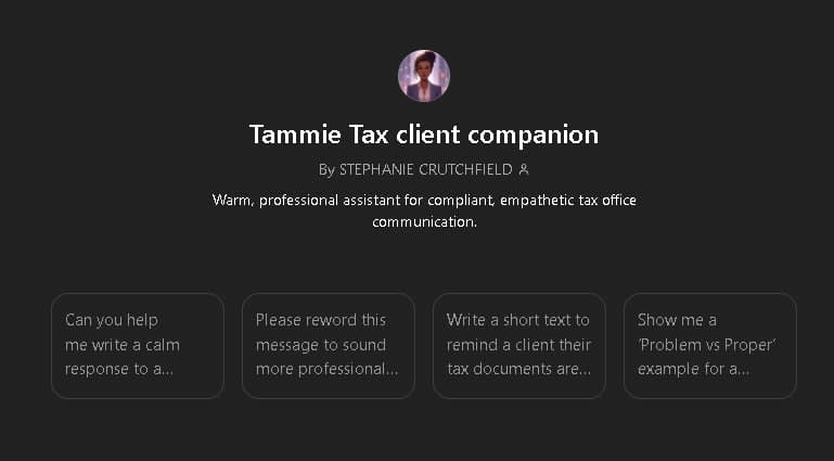 Enhance your client experience with Tammie Tax Client Companion ChatGPT AI Bot! 💰🤖 Perfect for tax professionals, this friendly AI assistant helps manage client communication, answer common tax questions, and improve efficiency. Keep clients informed and your workflow smooth — no template required!