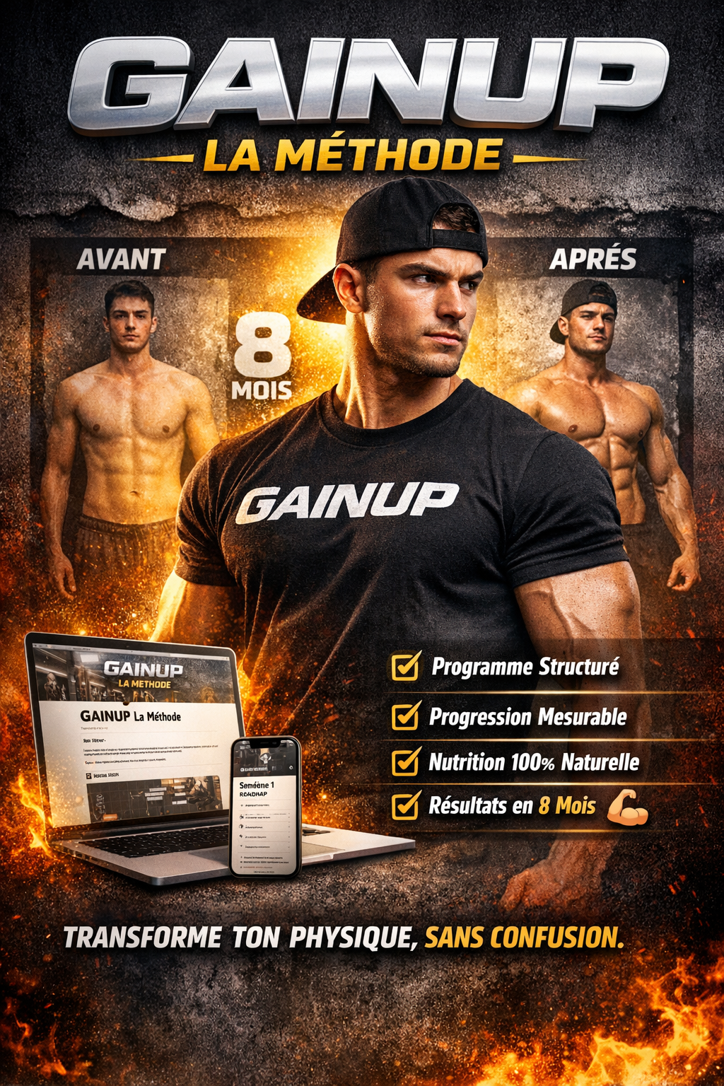 GainUp — La Méthode est un programme de musculation 100 % naturel pour débutants et faux débutants qui veulent arrêter de stagner et enfin progresser avec une structure claire. Tu y trouveras un système complet basé sur l’entraînement, la progression mesurable, les bonnes règles de récupération et les bases nutritionnelles essentielles. Si tu veux construire un vrai physique sans confusion, sans perdre 6 à 12 mois et sans suivre des conseils contradictoires, cette méthode a été pensée pour toi.
