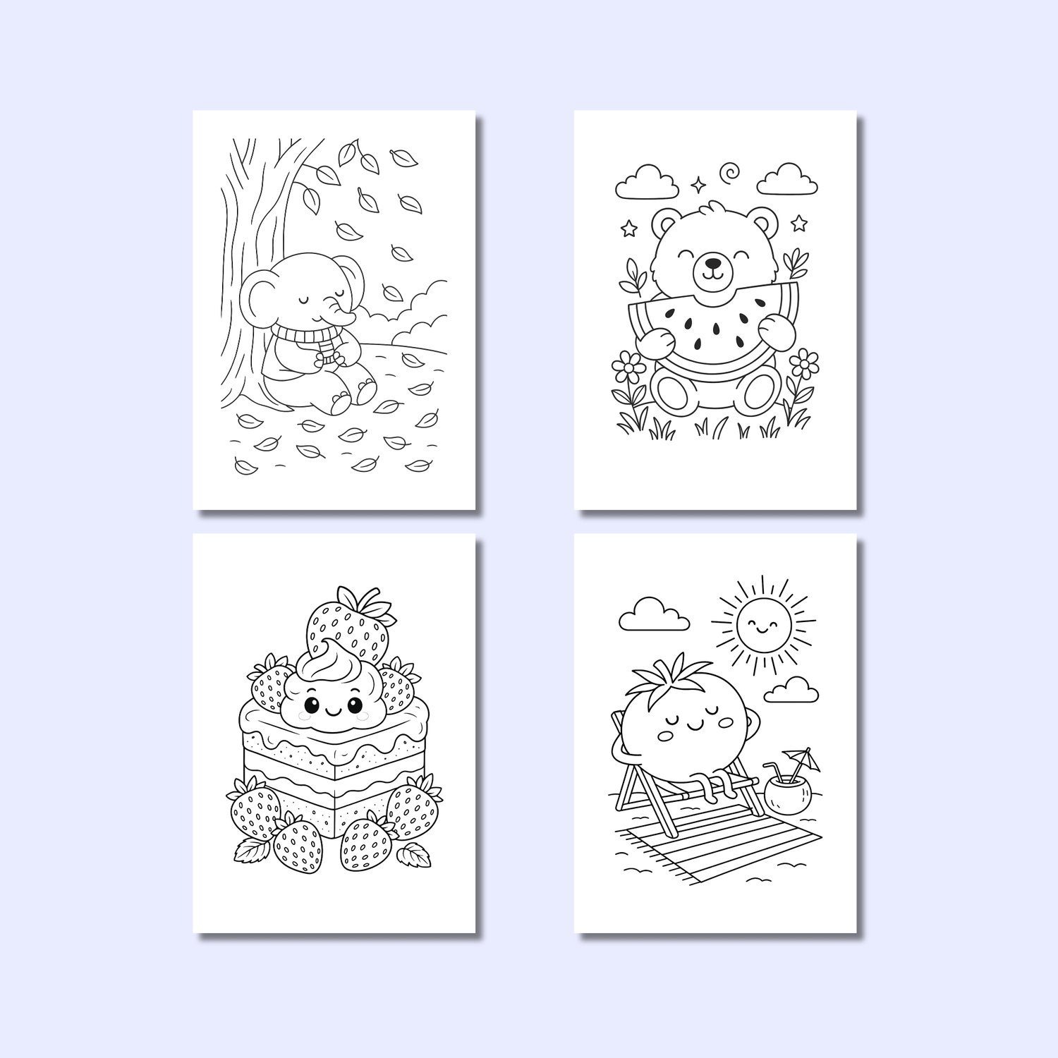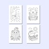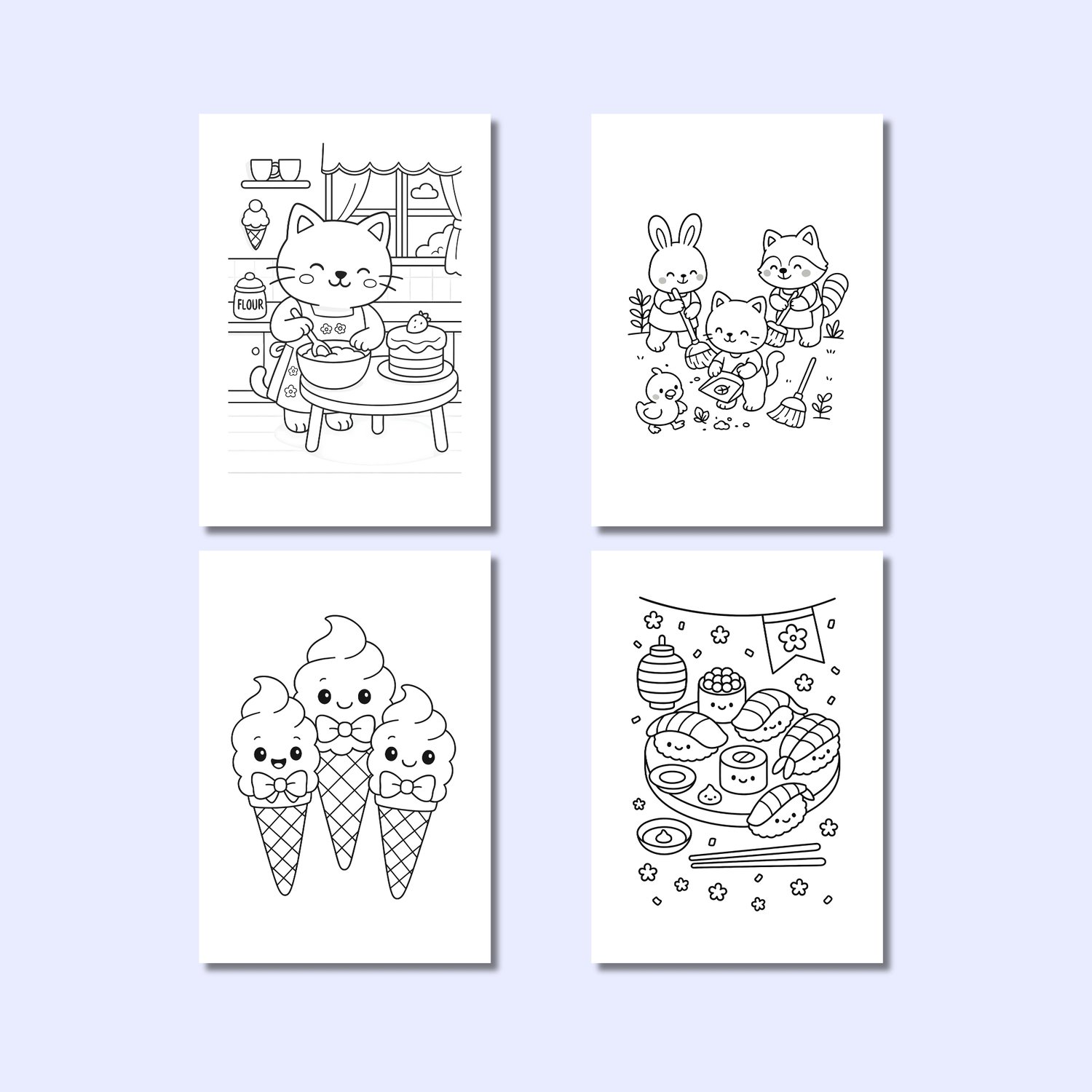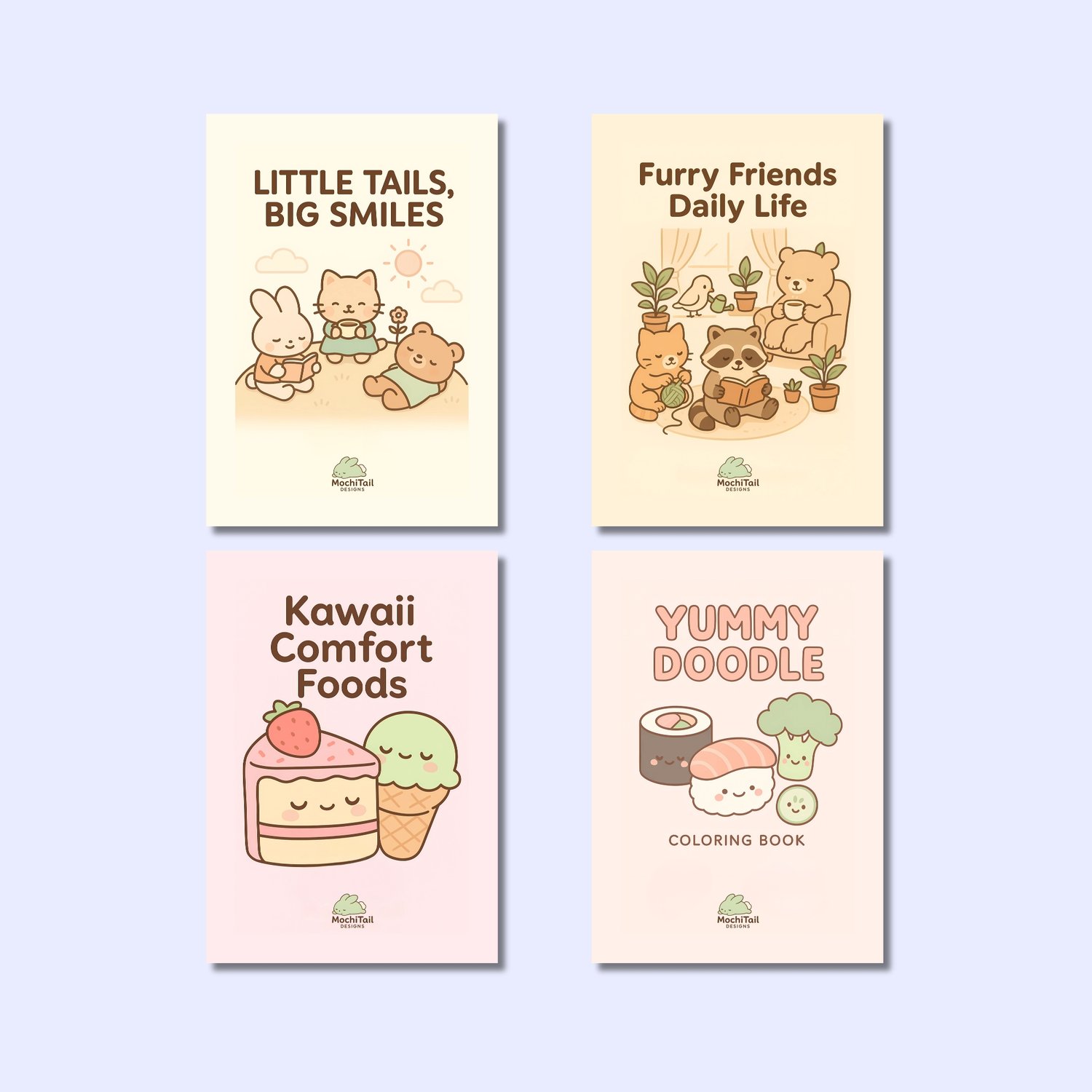 This adorable collection includes 4 mini kawaii-style coloring books, featuring friendly animals and sweet food characters — perfect for kids, teens, and adults who love charming, easy-to-color designs.