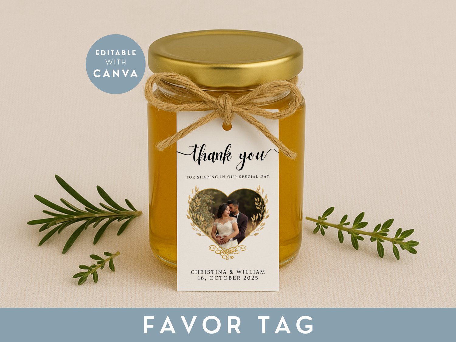 Showcase your memories with this framed photo thank you tag template for wedding favors. The editable Canva picture tag creates a printable thank you card with a charming couple photo frame layout.