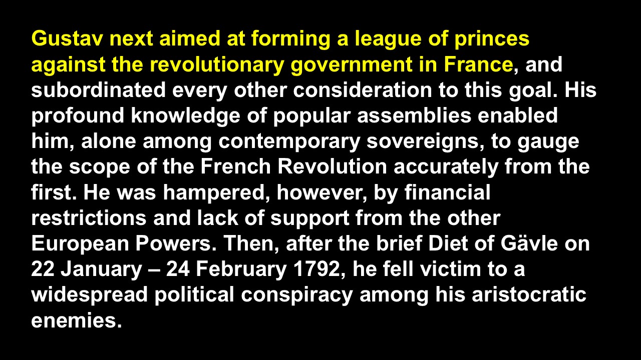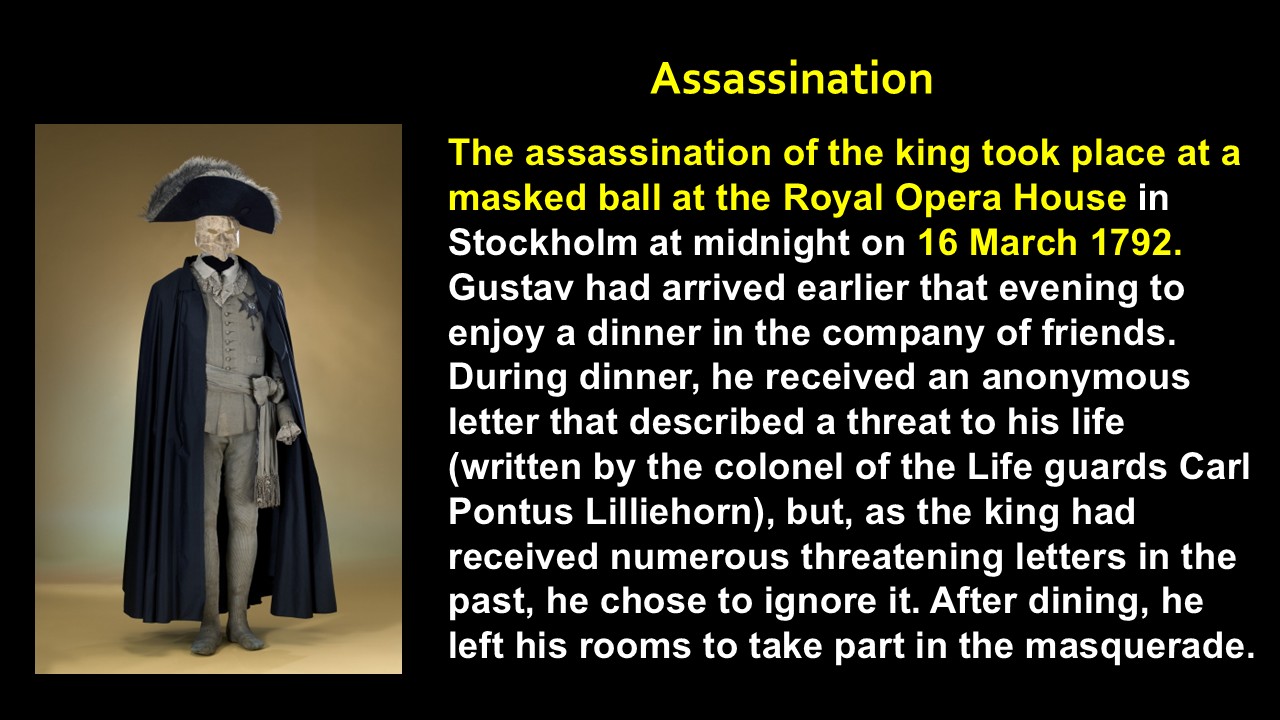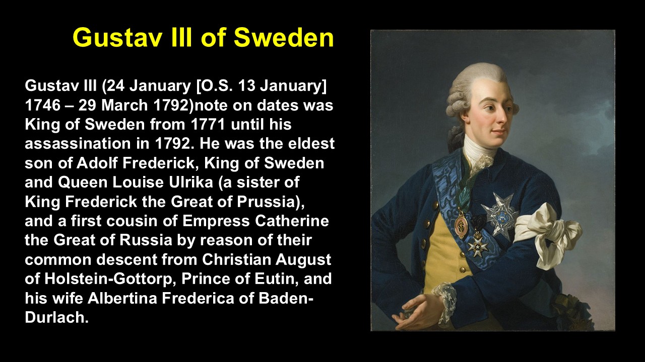 Gustav III (24 January [O.S. 13 January] 1746 – 29 March 1792)note on dates was King of Sweden from 1771 until his assassination in 1792. He was the eldest son of Adolf Frederick, King of Sweden and Queen Louise Ulrika (a sister of King Frederick the Great of Prussia), and a first cousin of Empress Catherine the Great of Russia by reason of their common descent from Christian August of Holstein-Gottorp, Prince of Eutin, and his wife Albertina Frederica of Baden-Durlach.