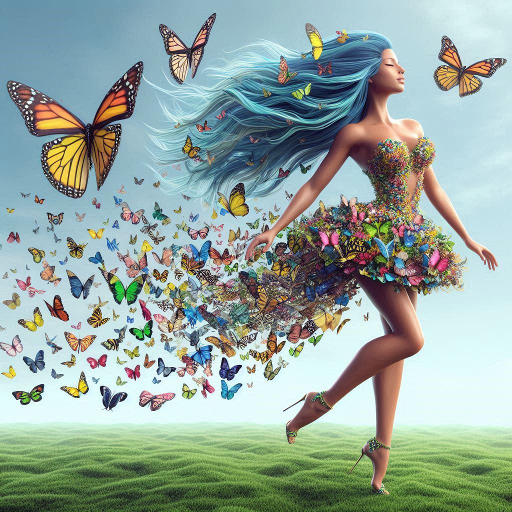 A whimsical vision of a woman skipping through a sunlit field, her dress a cascade of vibrant butterflies that flutter around her, symbolizing transformation, joy, and the delicate beauty of freedom. Each movement invites nature's gentle creatures to follow, creating a moment where art and life intertwine in colorful harmony.