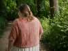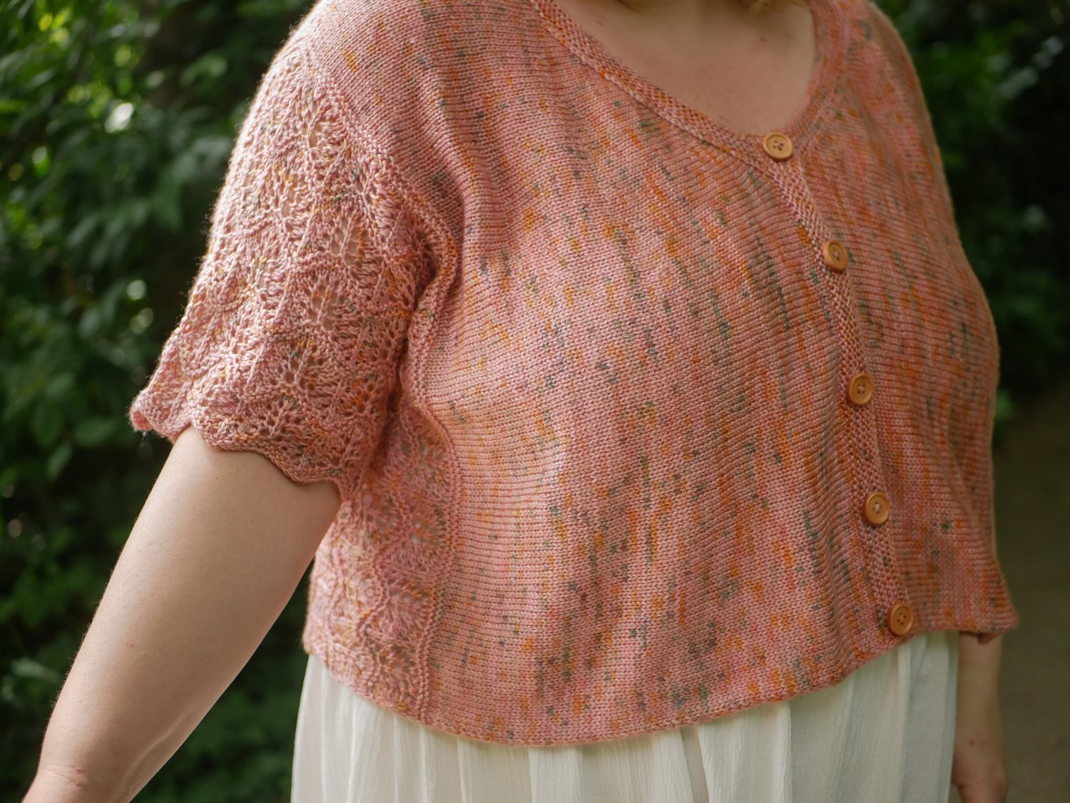 La manche est tricotée en rond puis le corps est ajouté via un montage turc qui permet ensuite de tricoter le corps en aller-retour. Une fois l’épaule tricotée, devant et dos sont finis séparément. Il ne reste alors qu’à faire les finitions au point mousse à l’encolure et aux bandes de boutonnage.