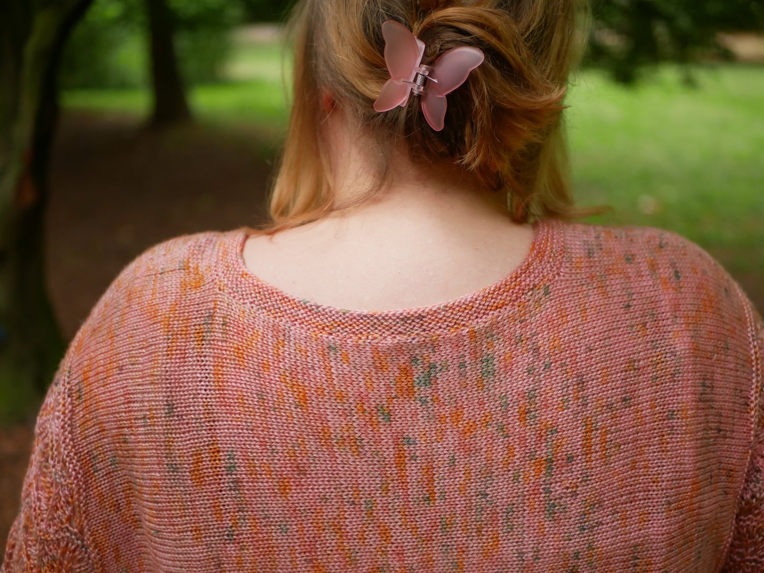 Il se tricote de la manche vers le milieu dos, mimant une construction drop shoulders. On commence par un coté puis l’autre qu’on assemble via un grafting dans le dos. L’ensemble est sans couture.