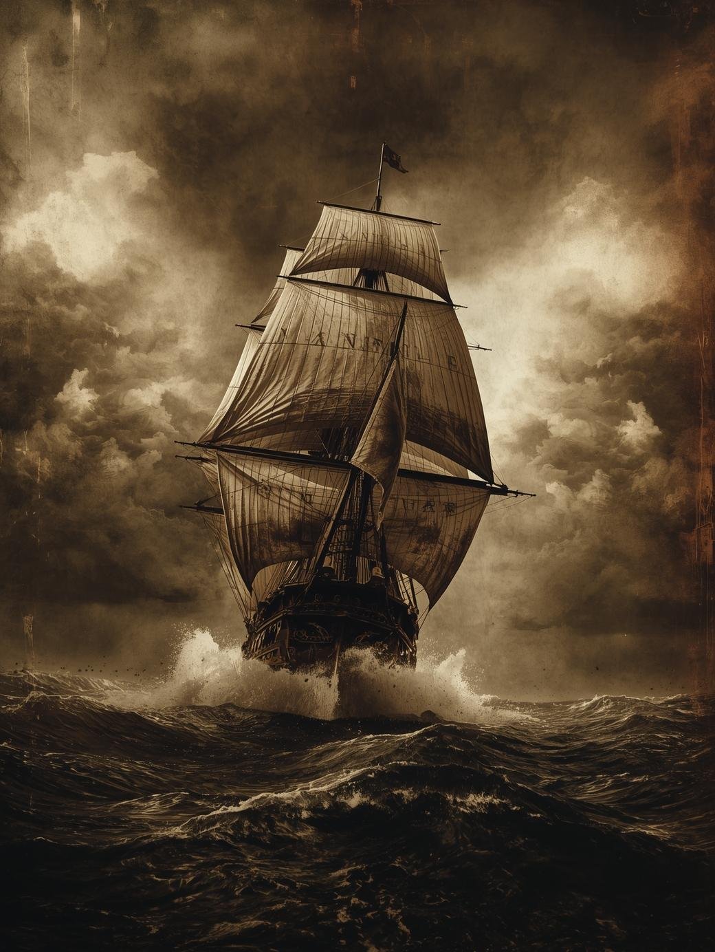 Majestatyczny żaglowiec sunący po otwartym morzu, osadzony na tle antycznej mapy, oddaje ducha podróży, wolności i odwagi.