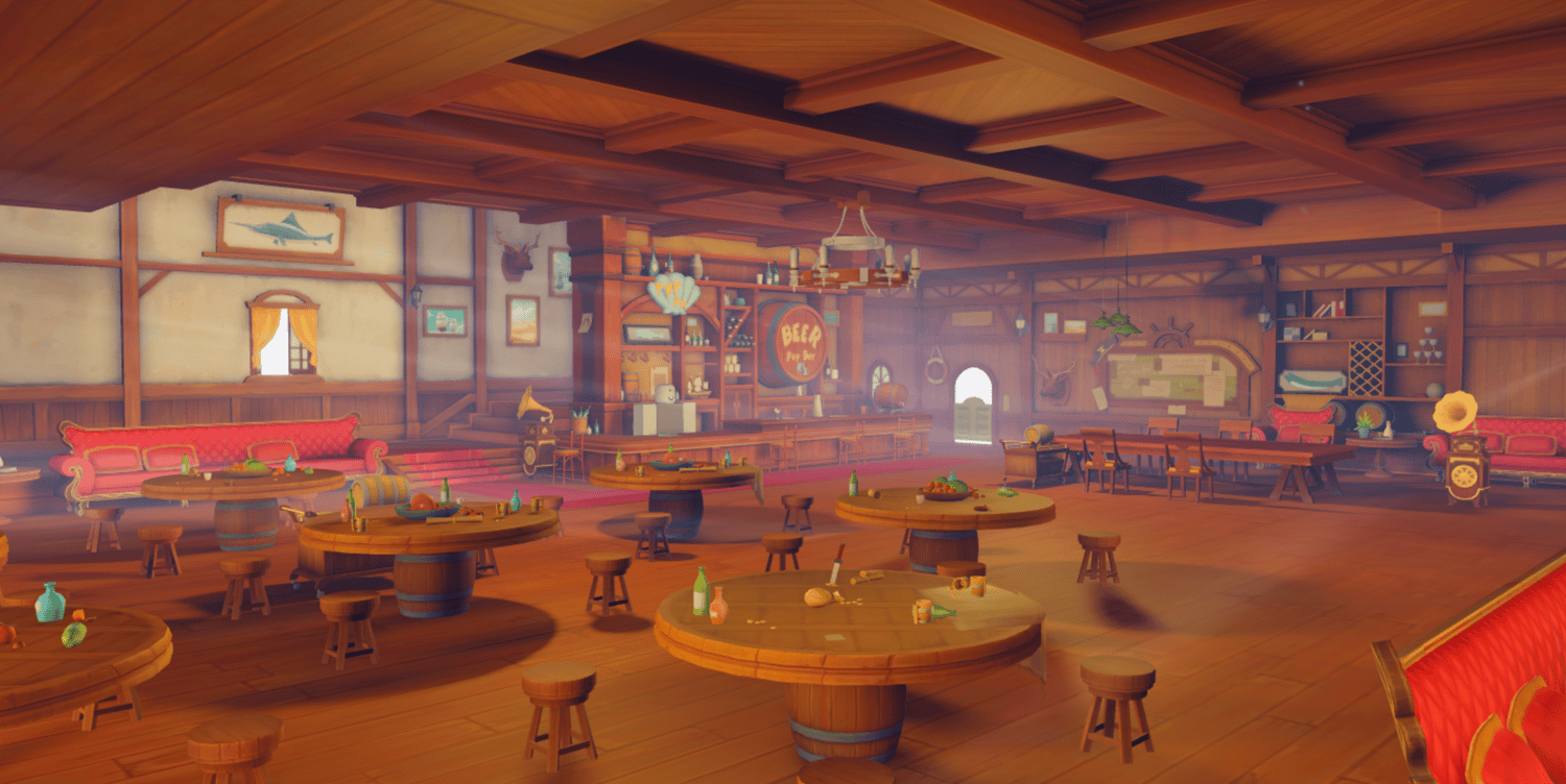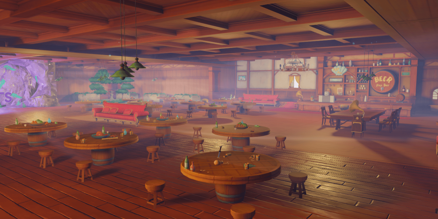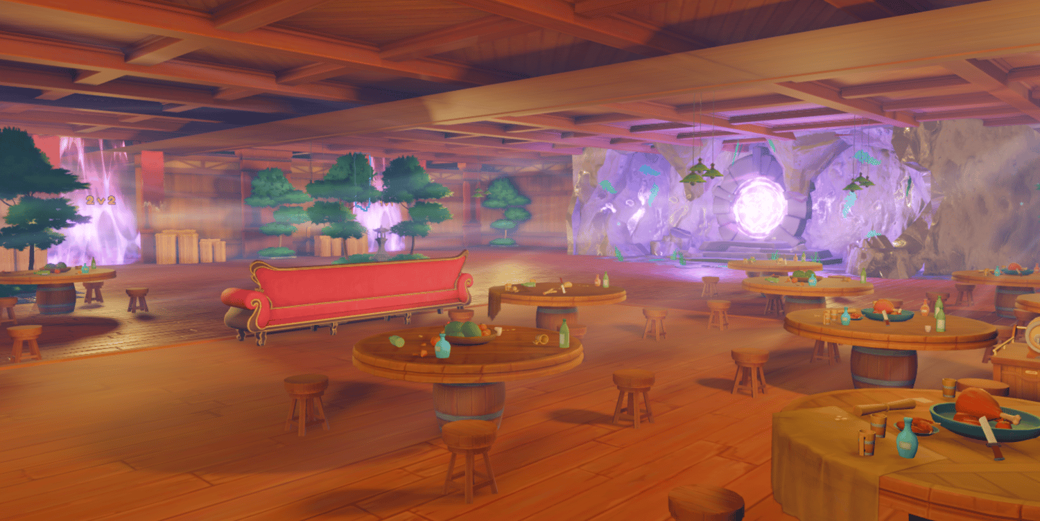 This detailed build features a spacious wooden interior filled with tables, chairs, and cozy seating areas, perfect for roleplay and gatherings. The tavern includes a fully stocked bar, decorative props, glowing crystals, and a magical portal entrance to enhance immersion. Warm lighting and fantasy-inspired details make it ideal for guild halls, RPG games, or social hangouts.