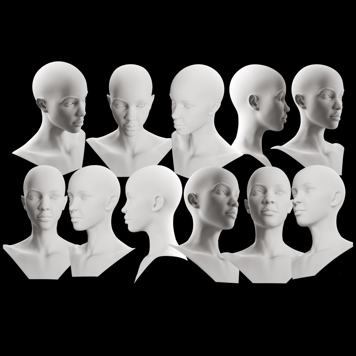 • 2 ZIP files containing a total of 11 high-quality 3D head base PNGs featuring various angles: