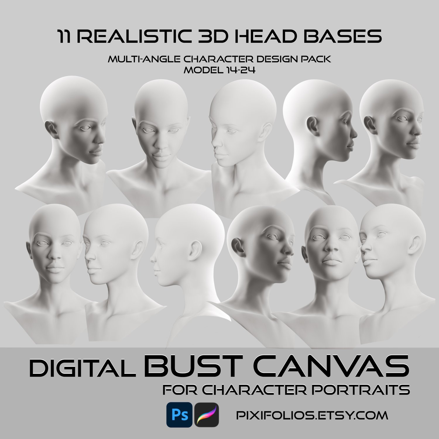 A handy bundle of 11 3D Realistic Head Bases (Models 14-24) designed to be used as base layers for character designs or portrait drawings.