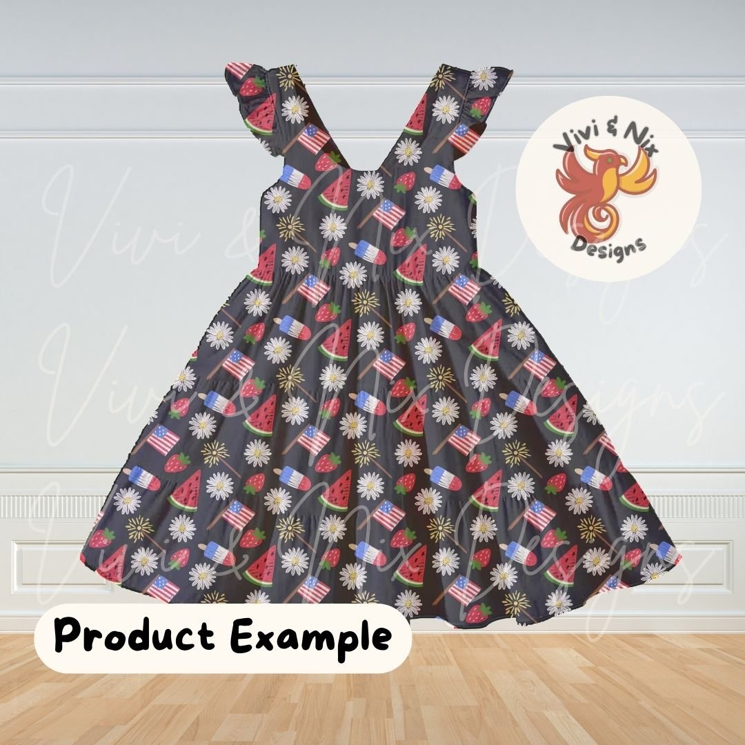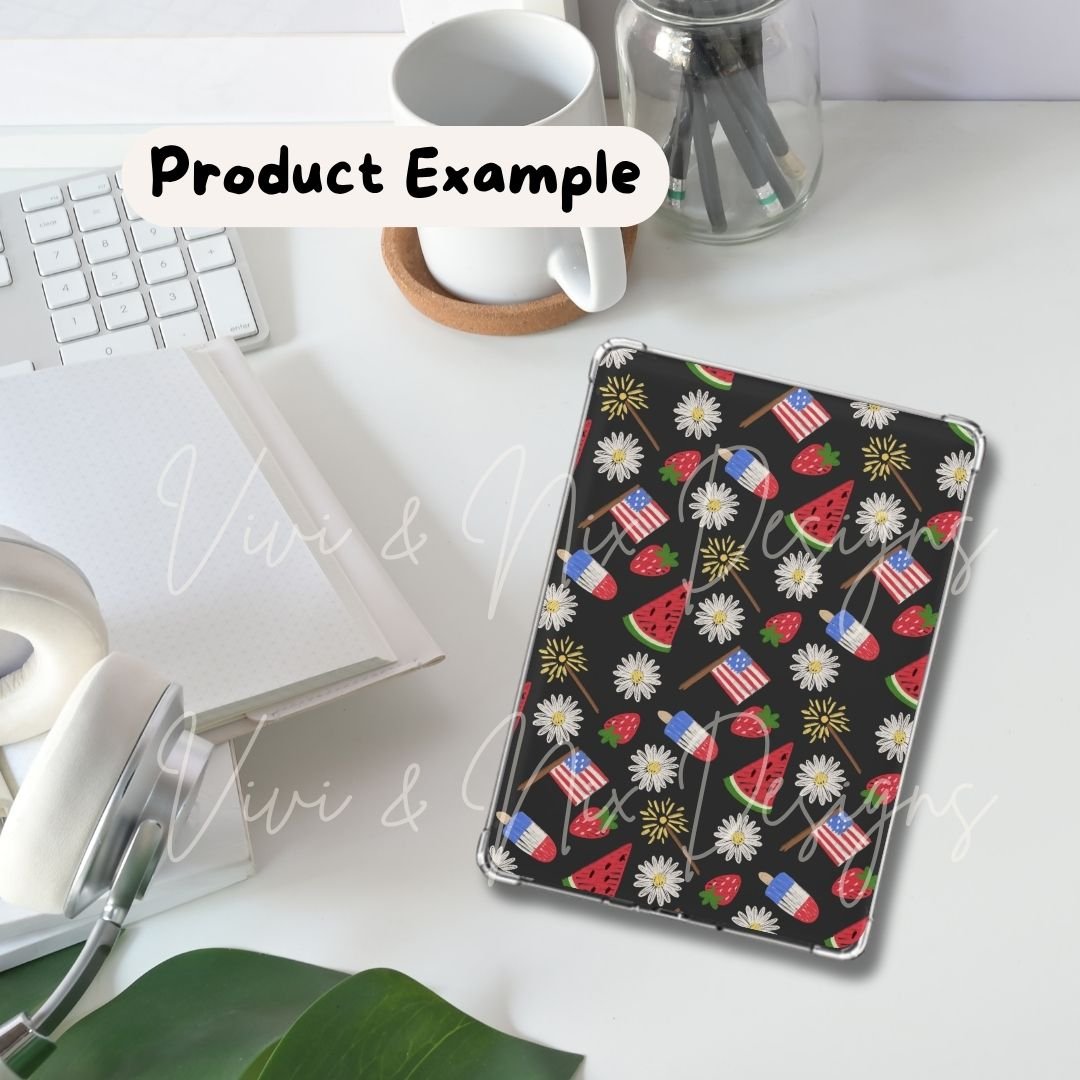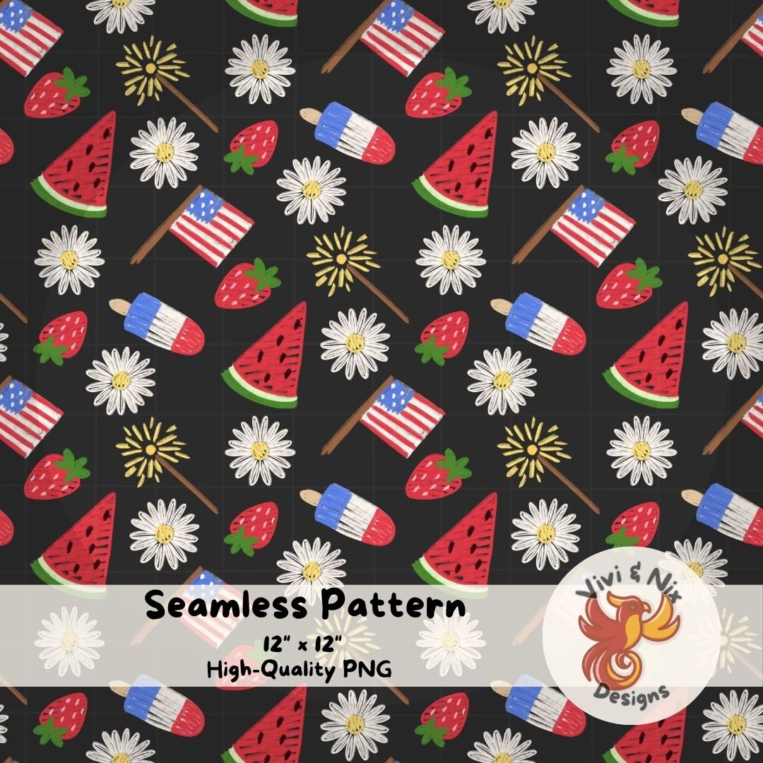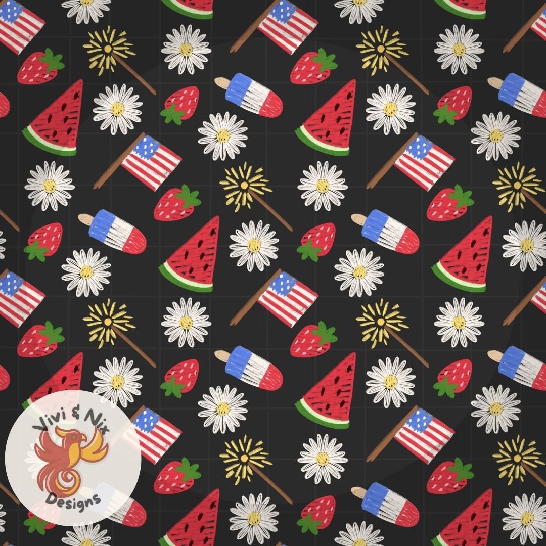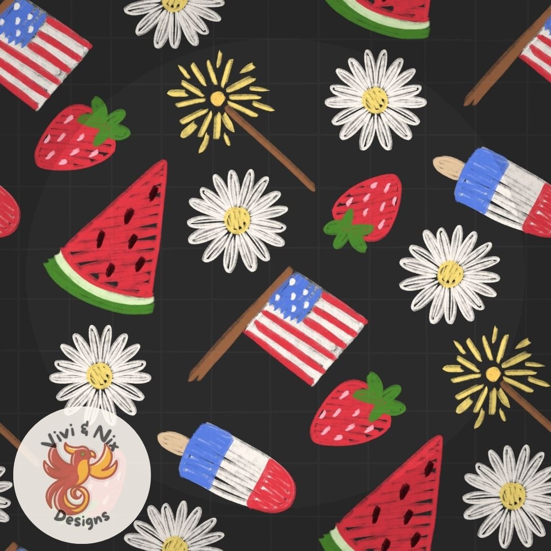 This hand-drawn design includes watermelon slices, strawberries, daisies, popsicles, fireworks, and American flags on a dark background—perfect for creating bold, festive products.