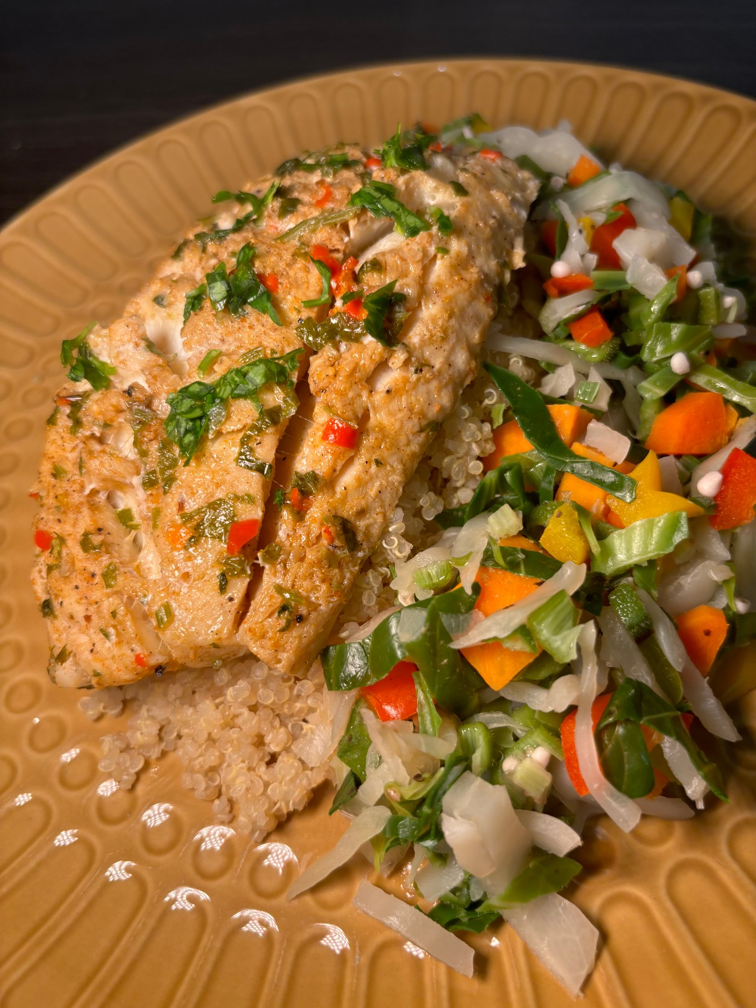 Jerk Lime Steamed Cod with Quinoa & Island Steamed Veg🍲