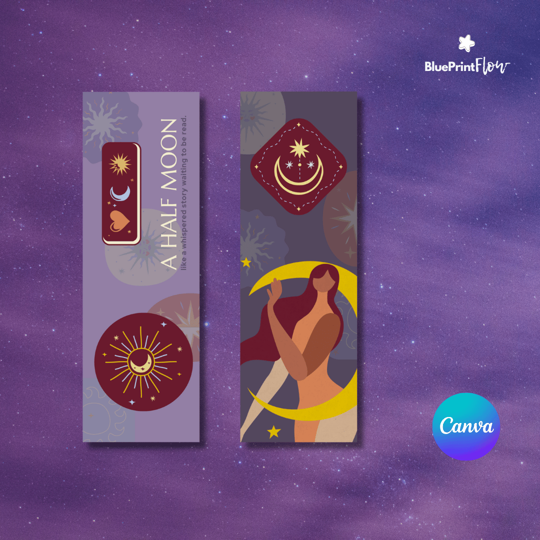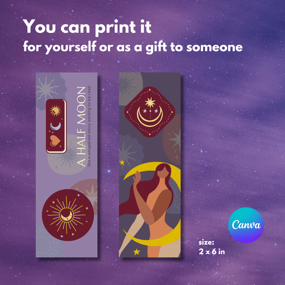 [FREE] Mystical Celestial Stamps Half Moon Bookmark Canva Template Design