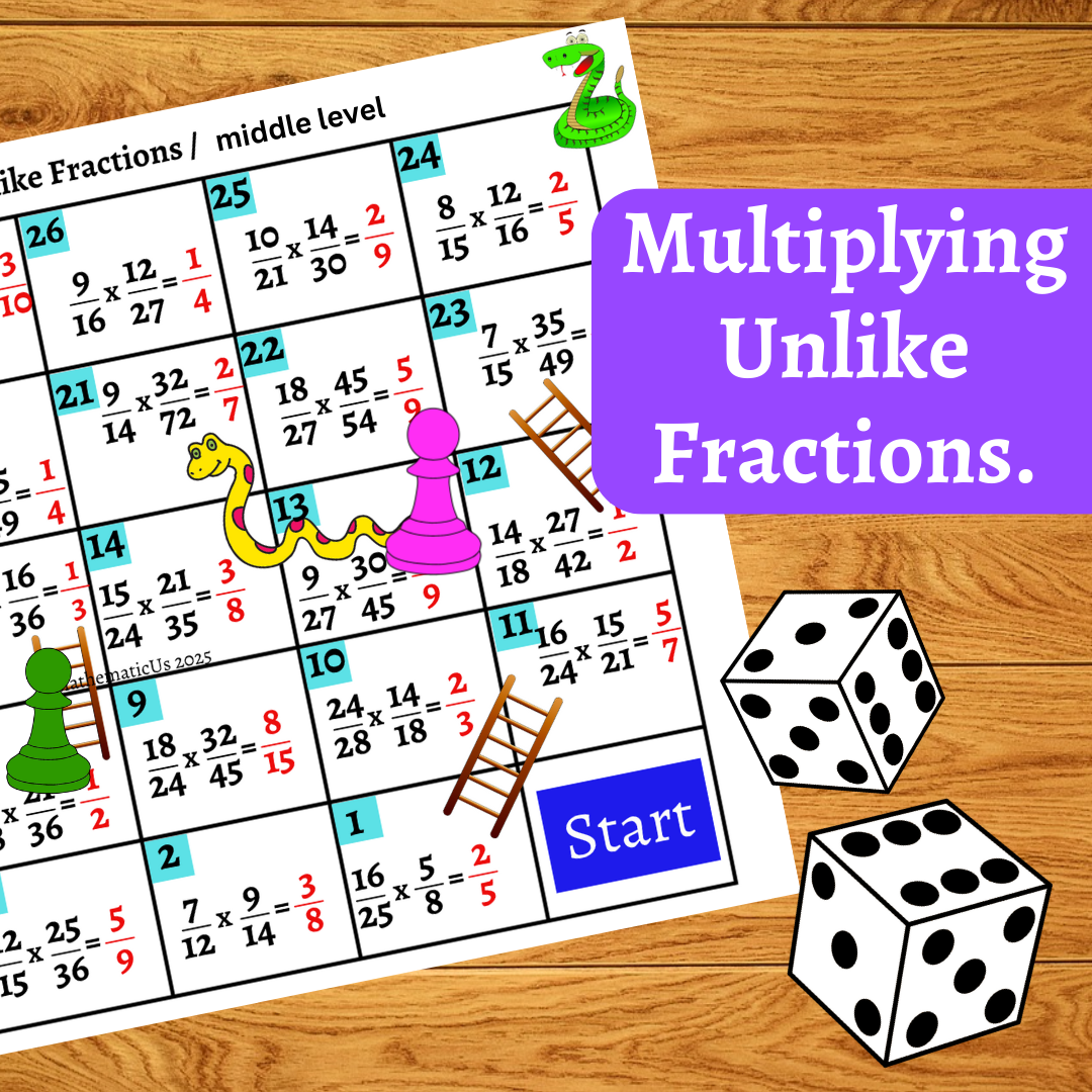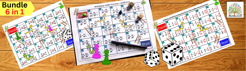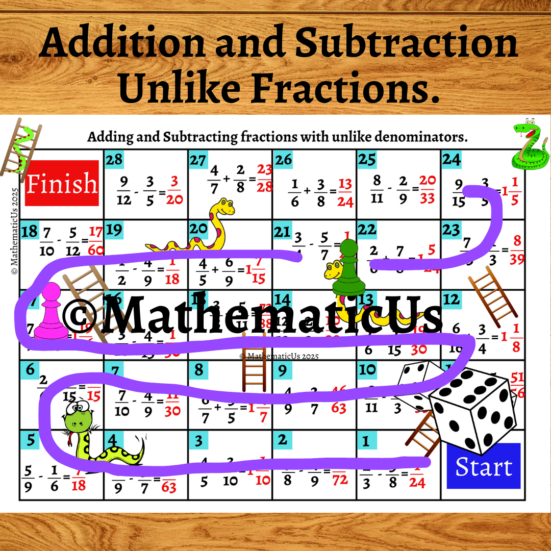 Make mastering unlike fractions exciting and engaging with this bundle of 6 printable Snakes and Ladders math board games! Designed for upper elementary and middle school students, this set covers all major fraction operations—perfect for reinforcing key skills in a fun, interactive way.