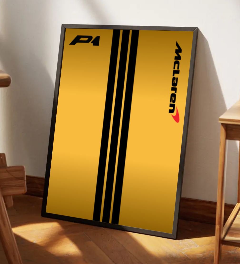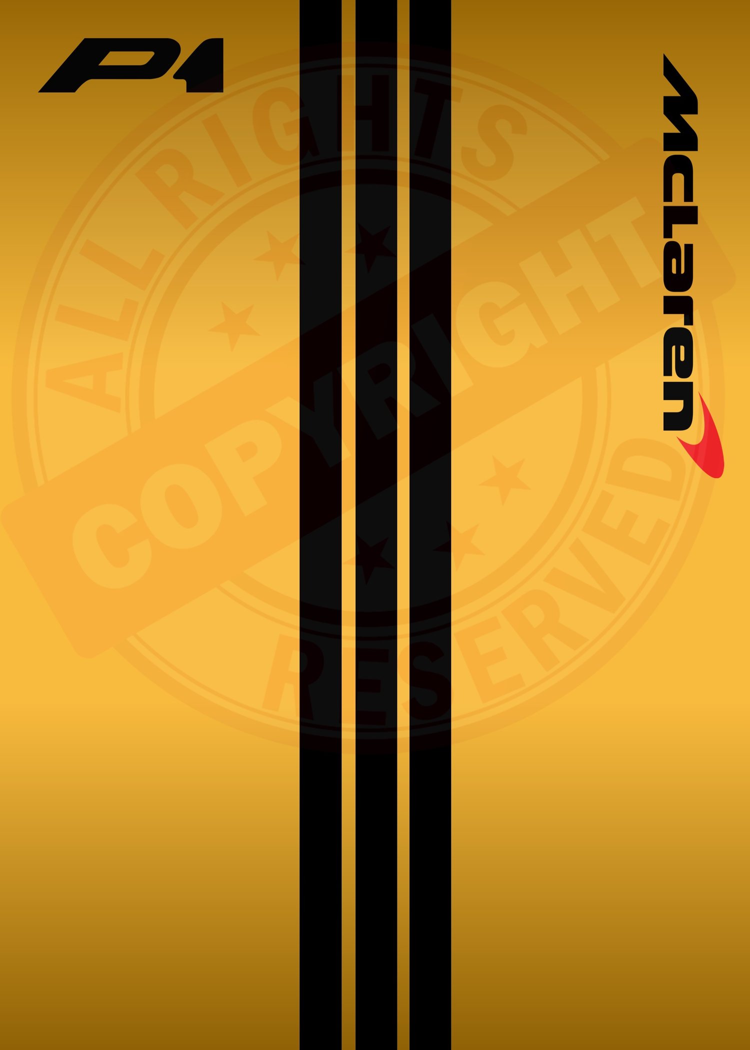 🚗 Design graphique épuré avec bande noire centrale sur fond jaune inspiré de la carrosserie iconique de la McLaren P1