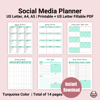 Social Media Planner Printable, Turquoise, PDF Printable, Instant Download, Fillable PDF, US Letter, Small Business Planner, Marketing Plan, Content Planner, Tracker for Facebook, Instagram, YouTube, Pinterest, Blog, etc.