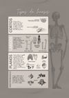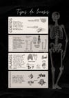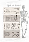 Este producto digital es una lámina imprimible en formatos A2 y A4 que contiene información detallada y visualmente atractiva sobre los diferentes tipos de huesos humanos: cortos, planos, largos e indeterminados, con ejemplos claros de cada uno de ellos.