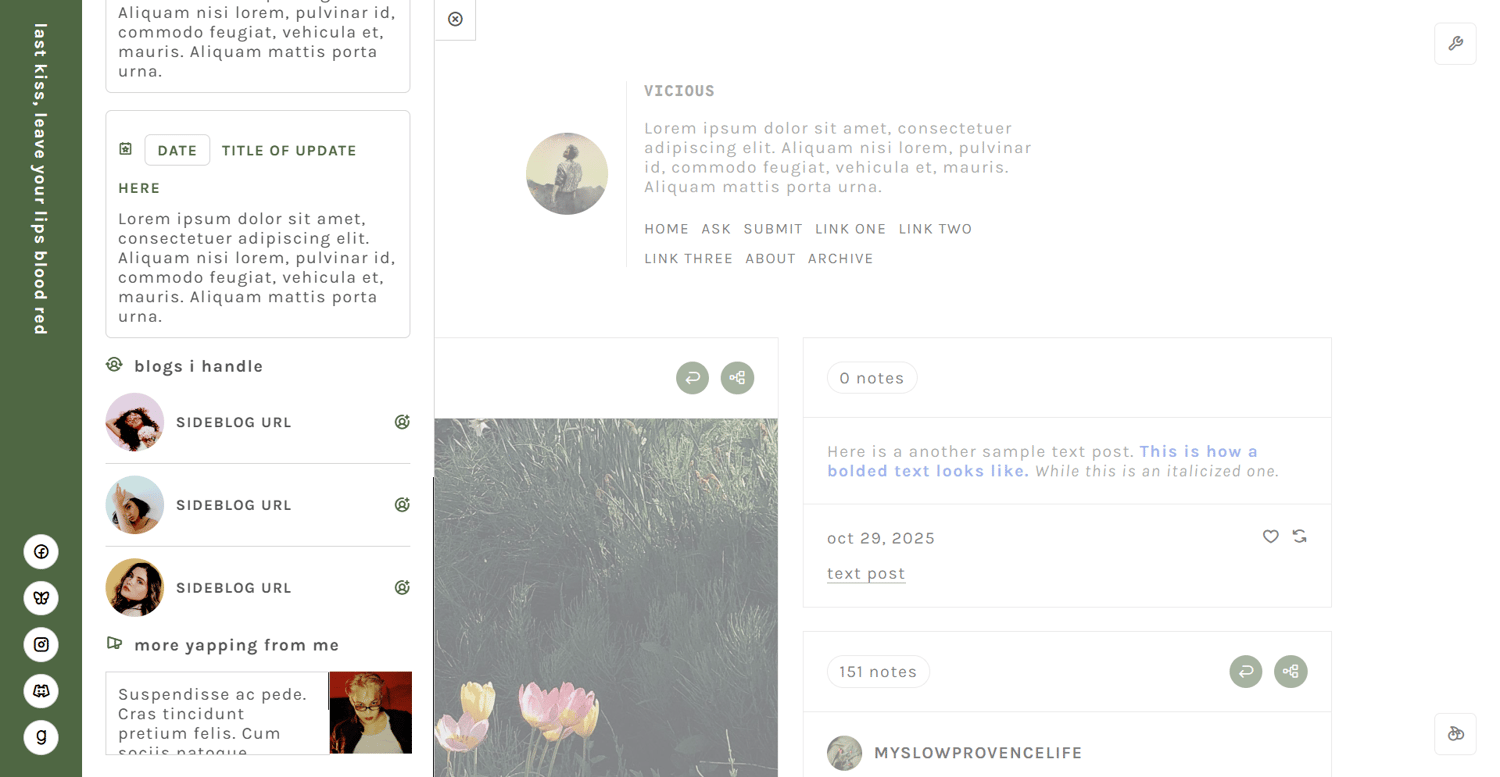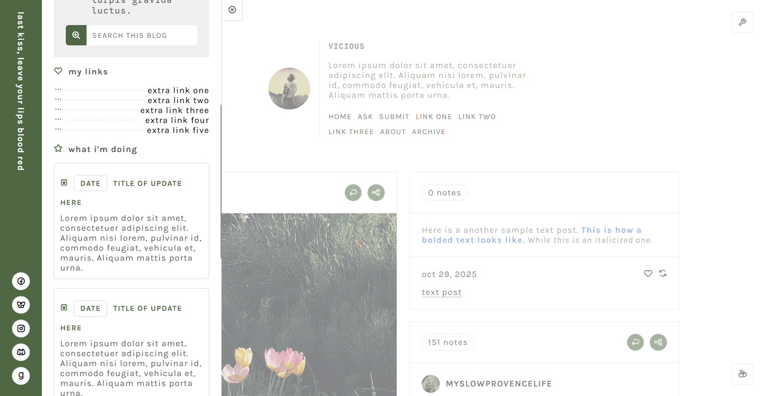 features: 70x70px icon image, blog title, blog subtitle, three custom links, 260x180px about header image, 70x70px about icon image, about title, about quote section, search bar, more links section, updates section, sideblogs section, extra notes section, 450px text posts however on the permalink page, there is an option for the post to be 450px to 540px