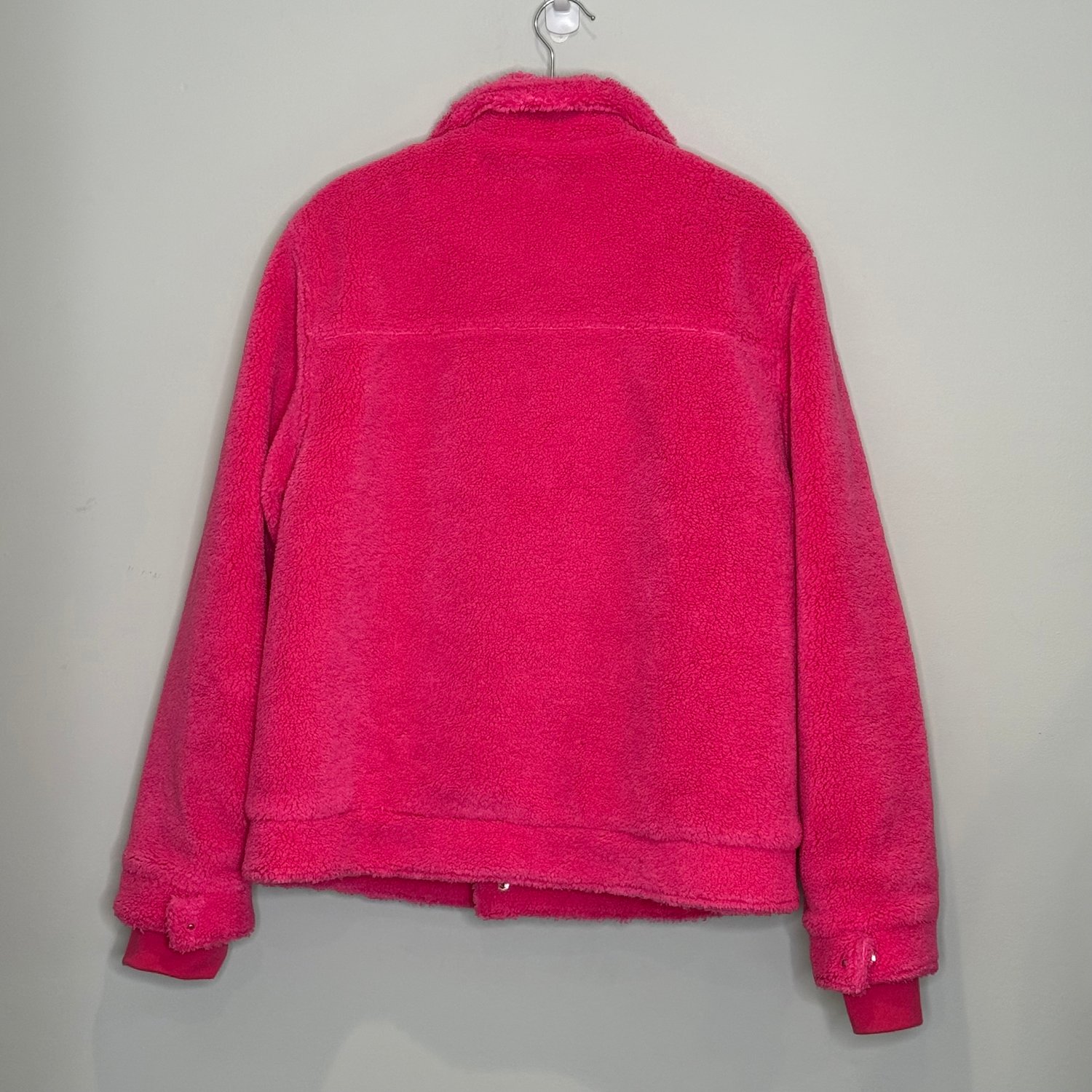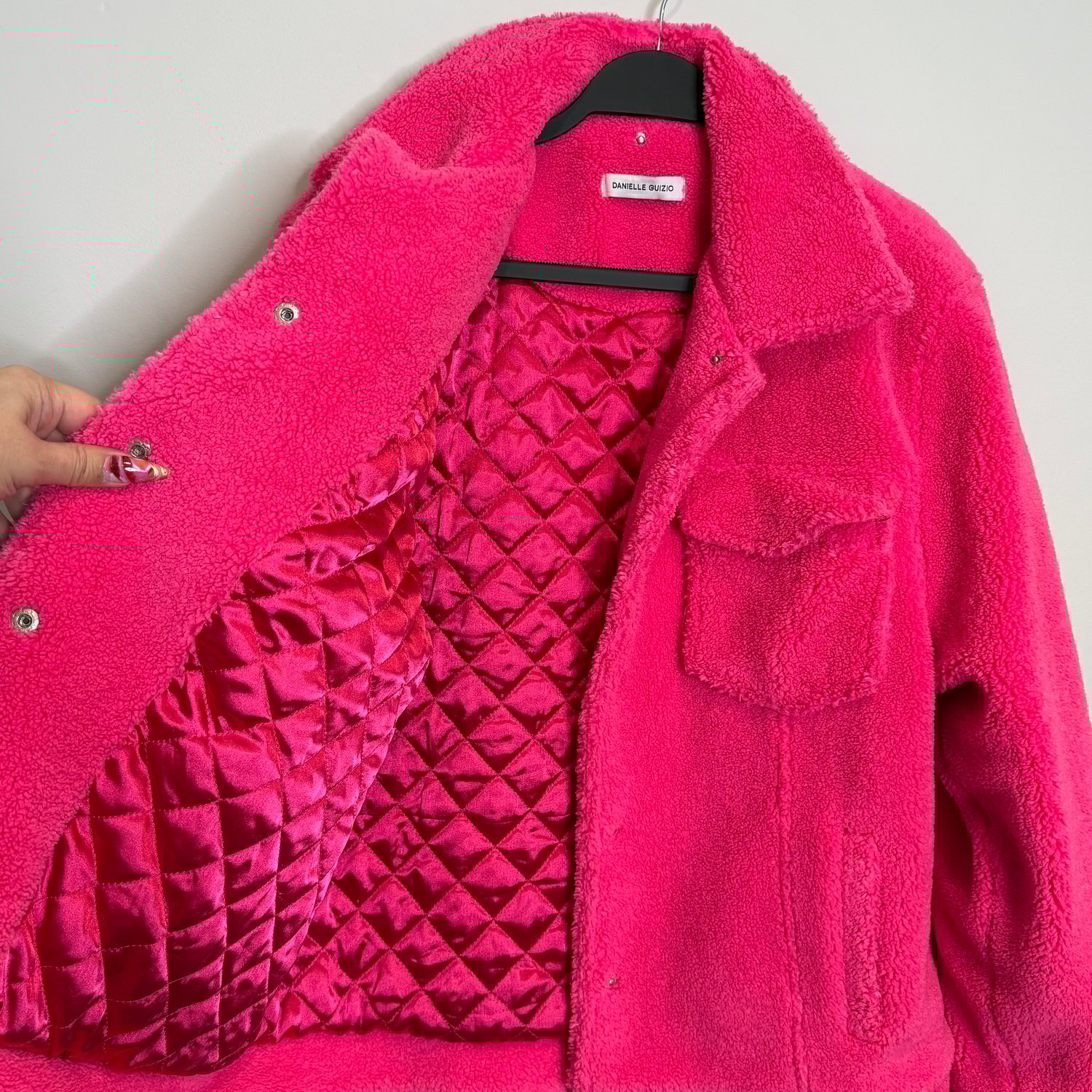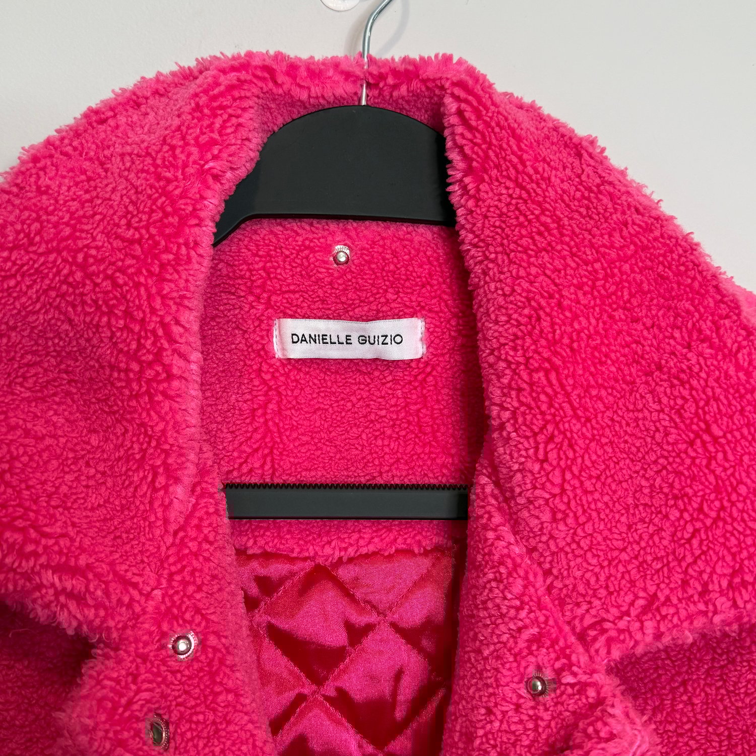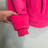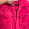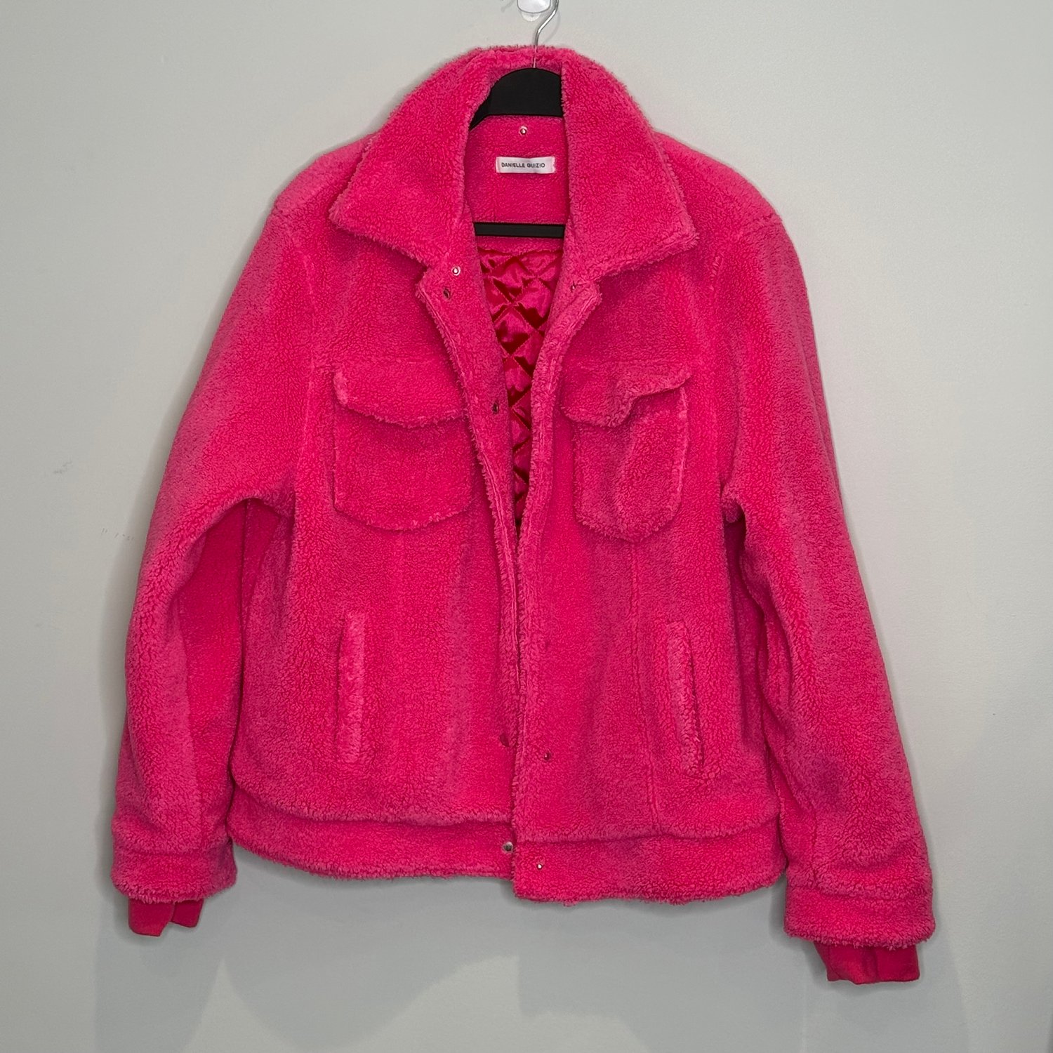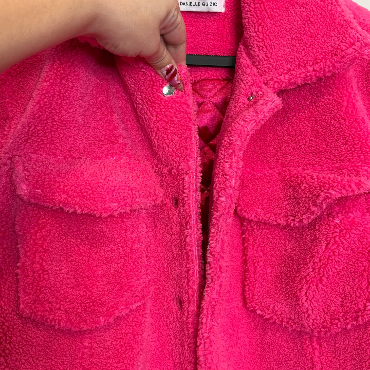 Danielle Guizio hot pink oversized teddy coat with outside pockets and an inside pocket and snap closure.
