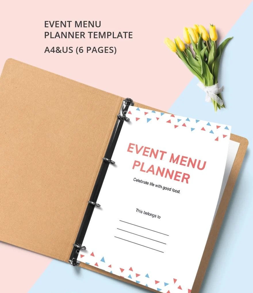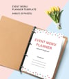 Event Menu Planner Template — 6-page printable A4 planner with information, menu categories, ingredient lists, grocery chart, budget totals, and notes; instant download PDF.