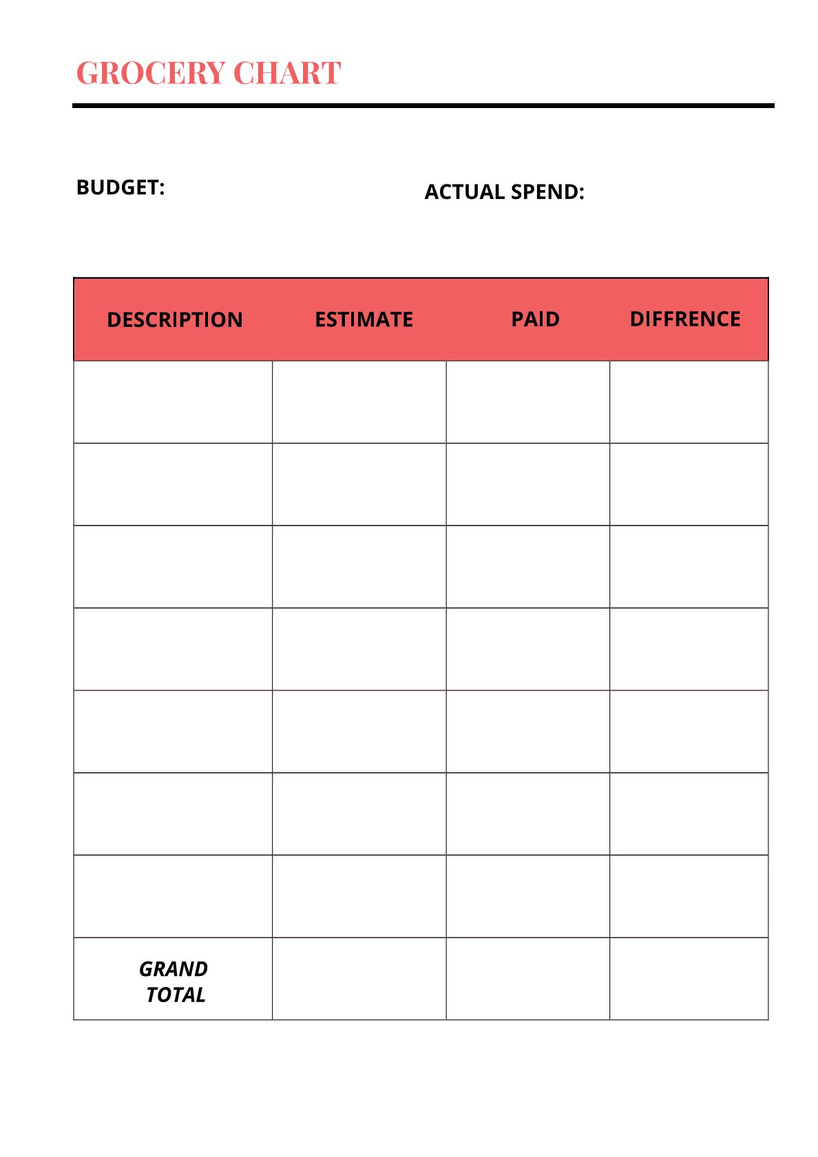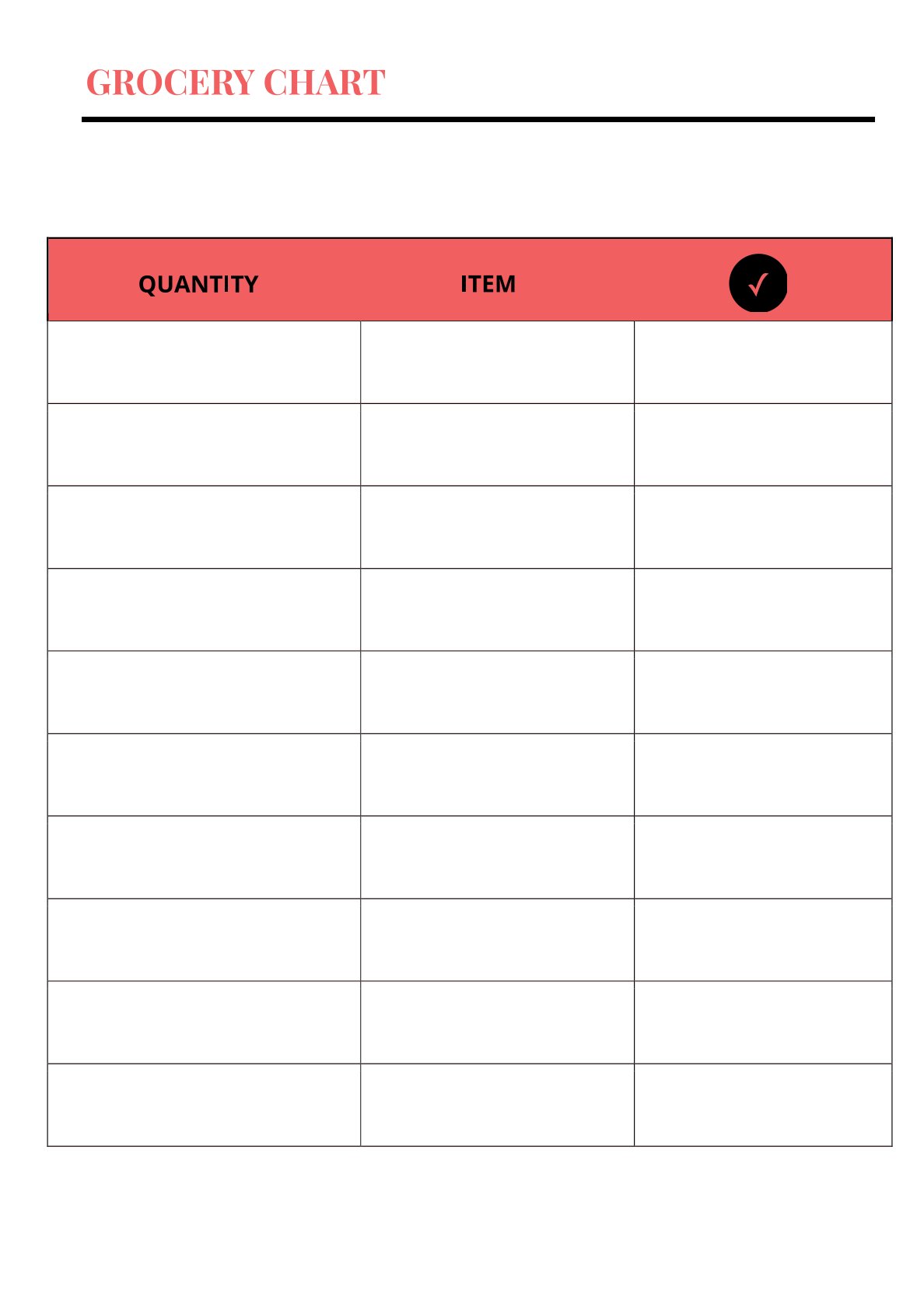 - Grocery Chart (Quantity & Item) for a focused shopping checklist.