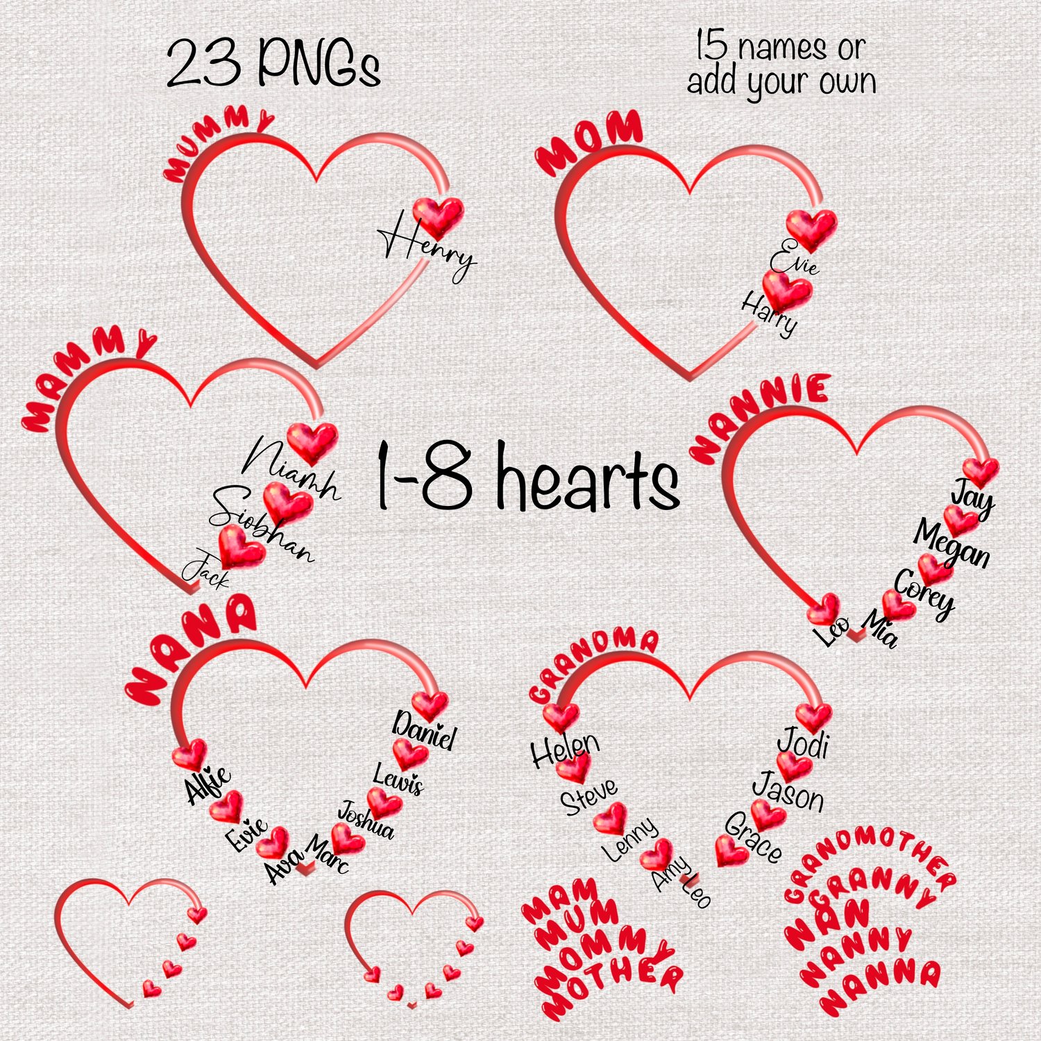 Heart with space for 1-8 children or grandchildren. 15 curved text names e.g. mum, grandma, nanny, Mom, Mummy etc or add your own. 23 PNG files. Sublimation, print. Personalise, customise. Please see pictures for all names included. 8 hearts, each with 1