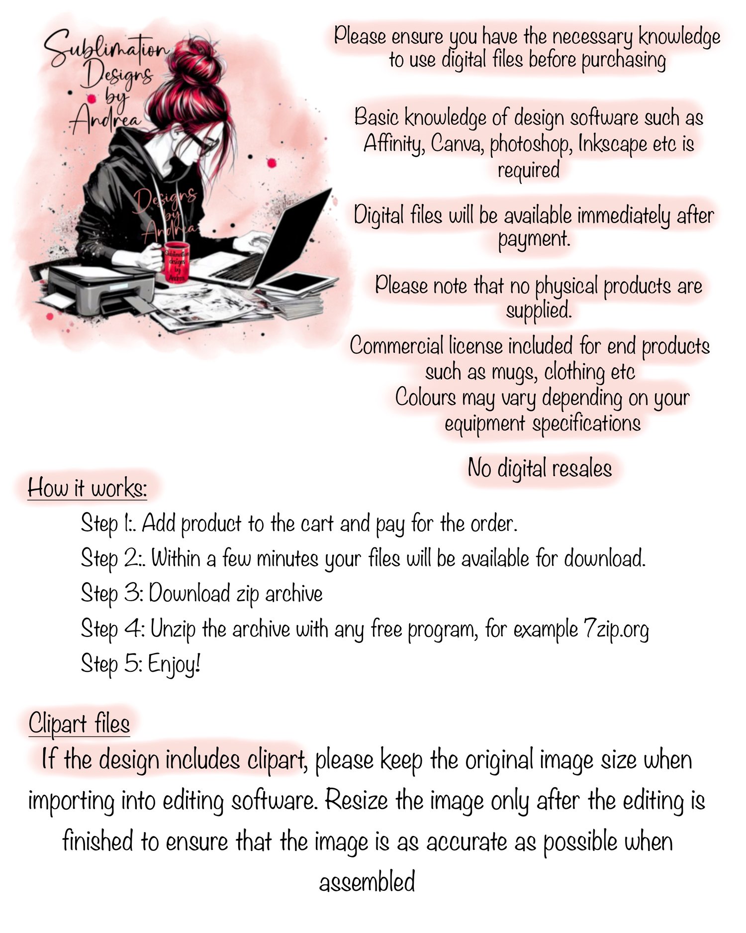 Commercial license included for all your sublimation and print end products such as mugs, cards, clothing etc. Digital resales are not permitted.
