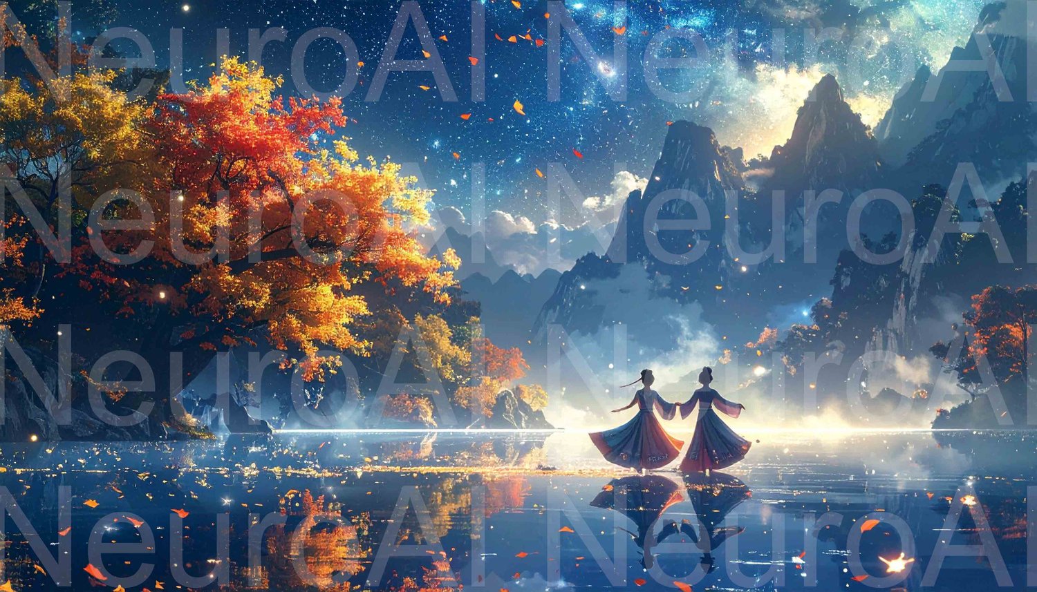 Enchanting night landscape with dancing figures and autumn trees