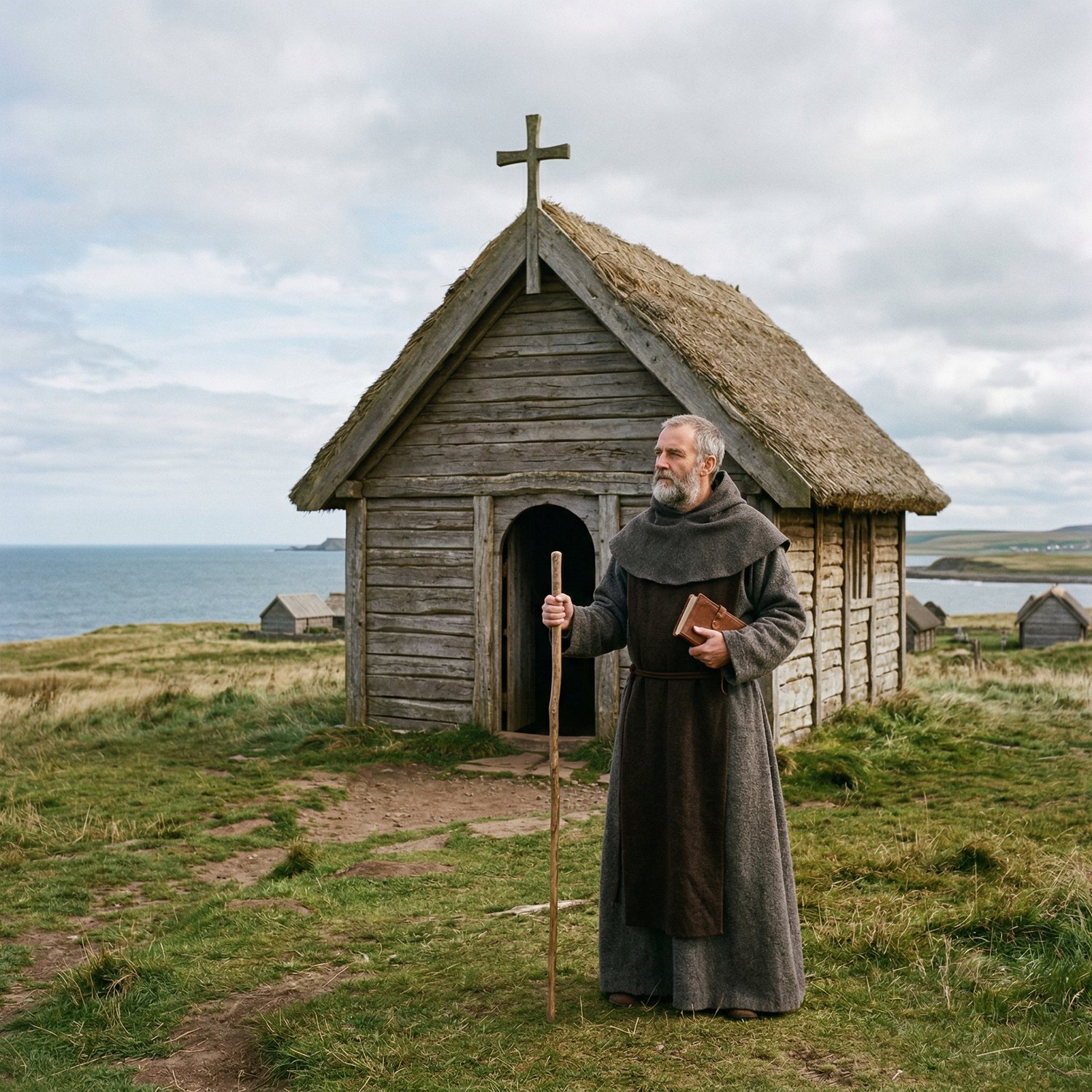Saint Cuthbert of Lindisfarne — a beautiful and powerful choice. A man of deep stillness, wisdom, and care, tending both the land and the soul. His presence in this artwork brings a sacred continuity.