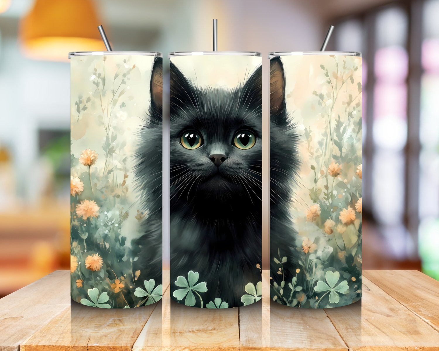 This soft, dreamy tumbler design features a beautiful black cat with striking green eyes surrounded by delicate wildflowers and clover accents. The gentle watercolor-style background and nature-inspired tones create a peaceful, cozy aesthetic that cat lovers will instantly adore. The full-wrap artwork brings the illustration to life from every angle, making it both eye-catching and heartfelt.