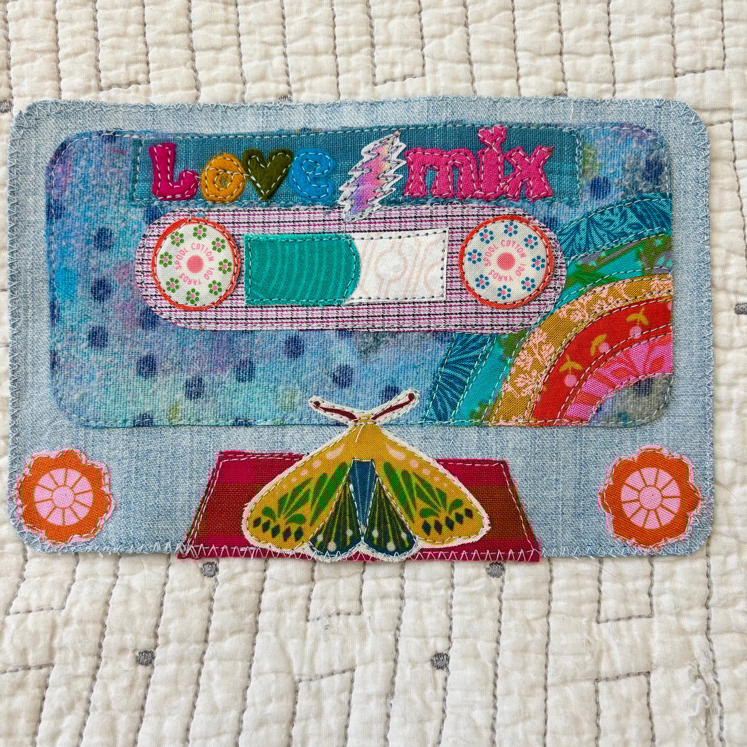 The Mixtape Magic cassette patch is one of my most intricate and satisfying designs, packed with personality: a rainbow peeking out the side, fabric letters you choose yourself, two little circles made from your favorite patterned scraps, and a spot at the bottom for something special — a butterfly, a flower, a dancing bear, whatever makes your heart sing.