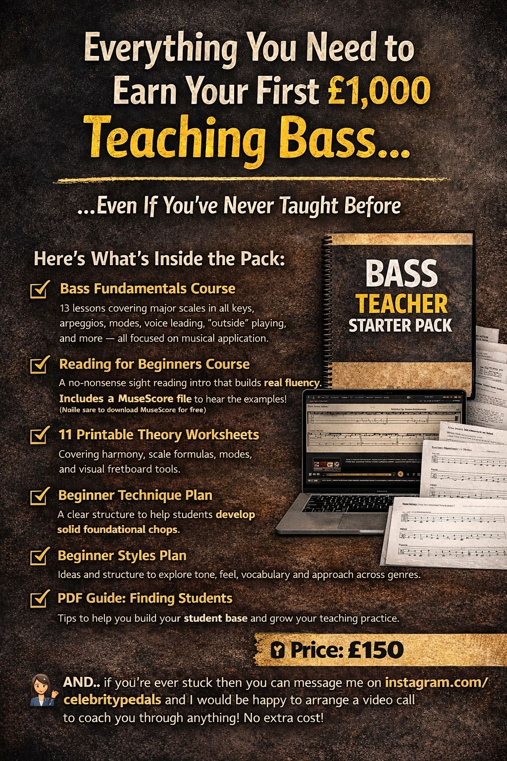Everything you need to start earning as a bass teacher. All the lesson plans, theory worksheets & student-ready material you need with lifetime teaching rights.