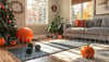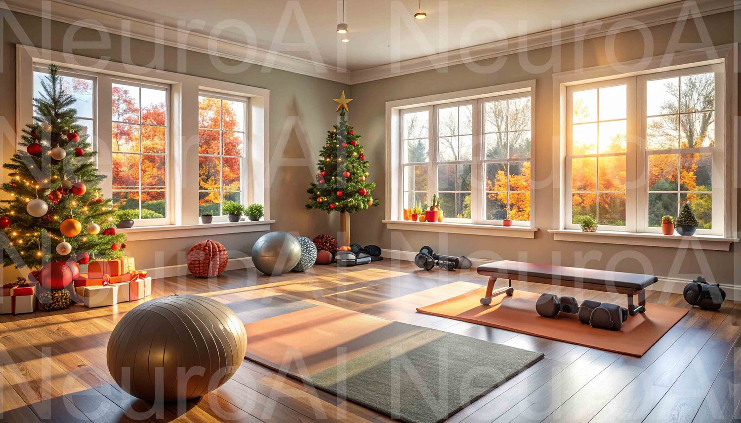 Cozy living room with Christmas tree, pumpkins, and fitness gear