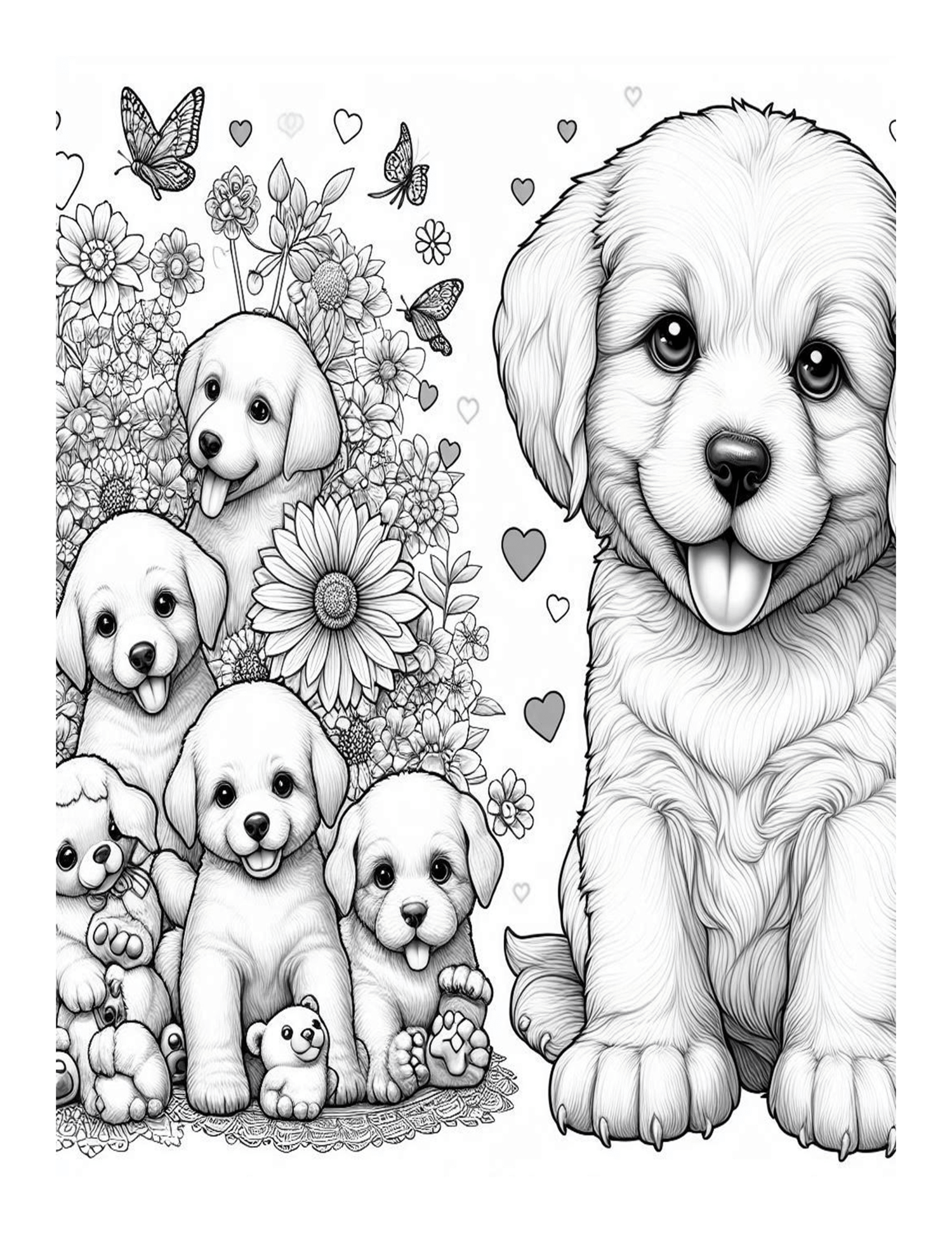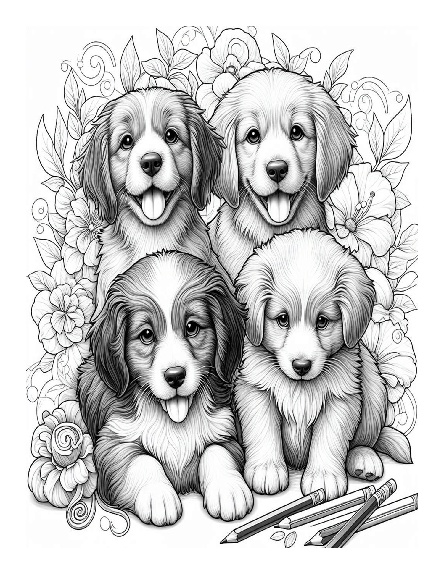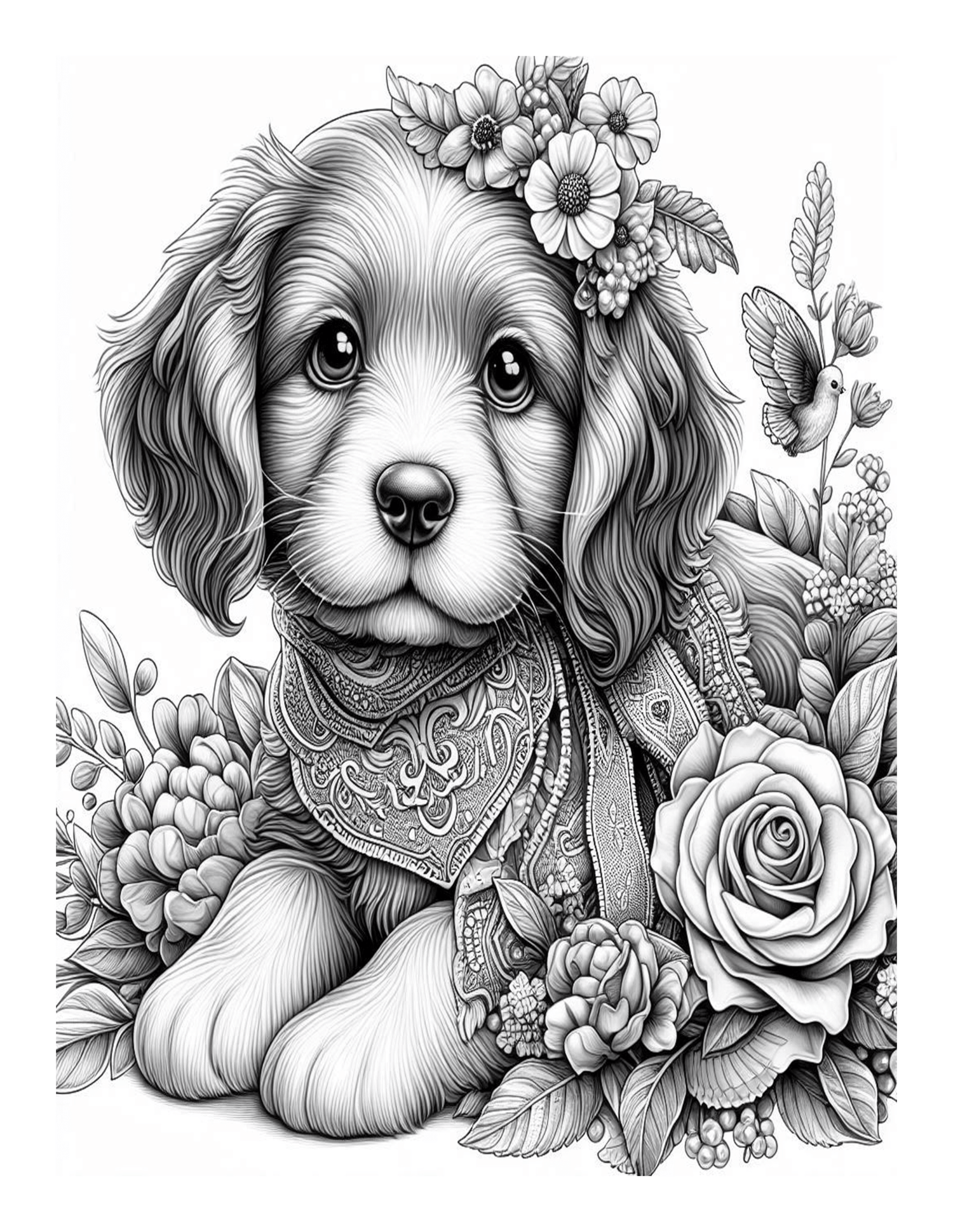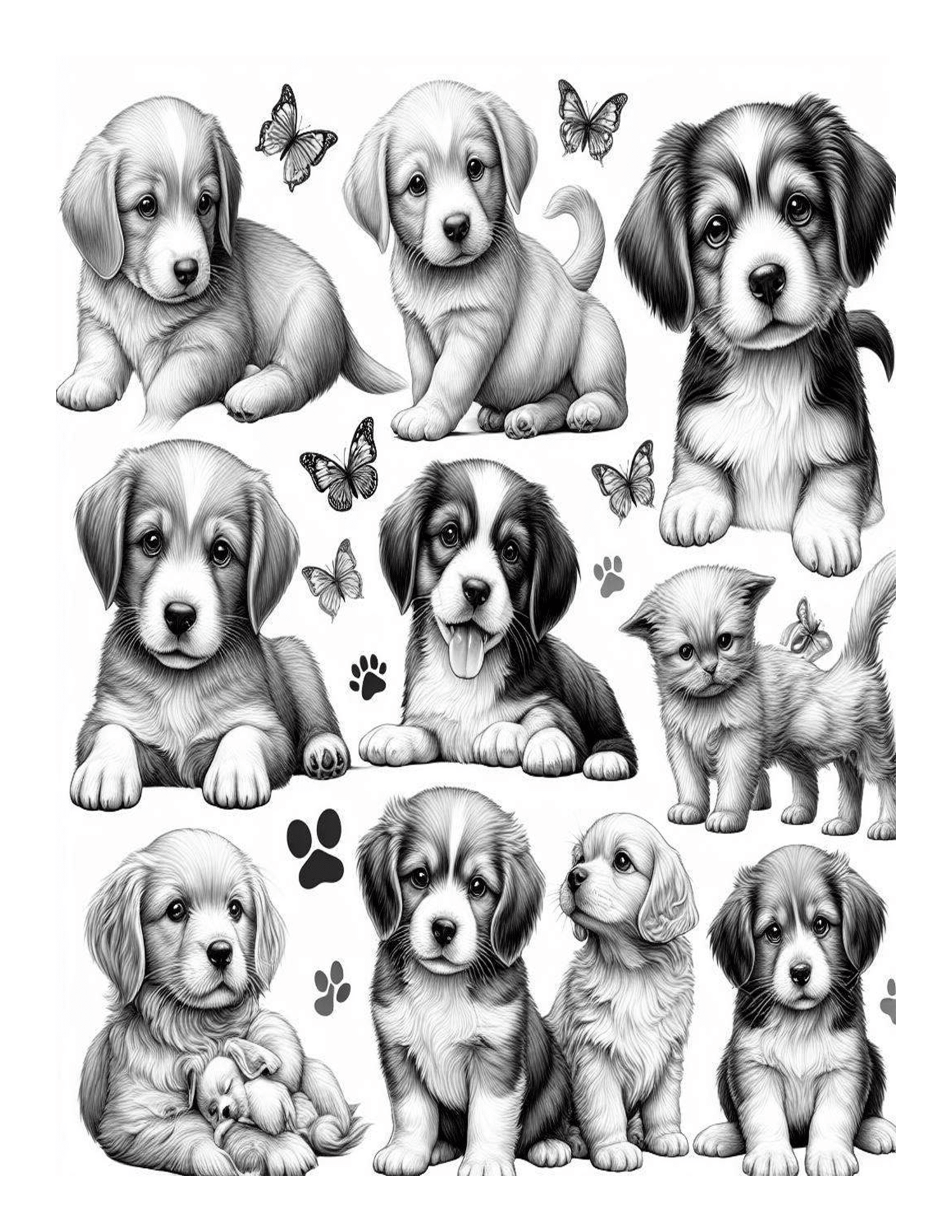 Grayscale Beautiful puppies and dogs Coloring Pages for Adults to enjoy Coloring for Stress Relief