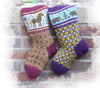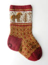 This is a pattern for a knitted stocking for decorations or to hold small gifts. It is worked in the round from the cuff down and using the Fair-Isle knitting technique. In addition, Duplicate st and basic embroidery are used to add tails, manes, etc..