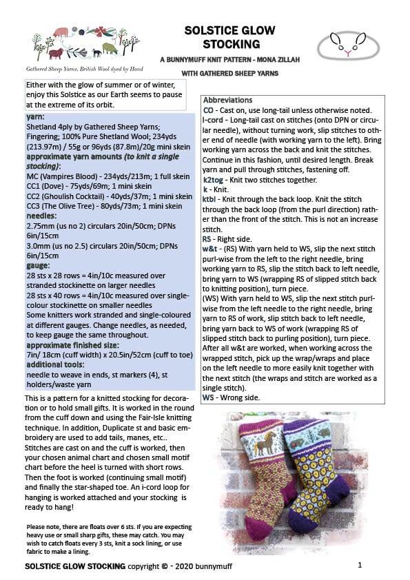 Stitches are cast on and the cuff is worked, then your chosen animal chart and chosen small motif chart before the heel is turned with short rows. Then the foot is worked (continuing small motif) and finally the star-shaped toe. An i-cord loop for hanging is worked attached and your stocking is ready to hang!