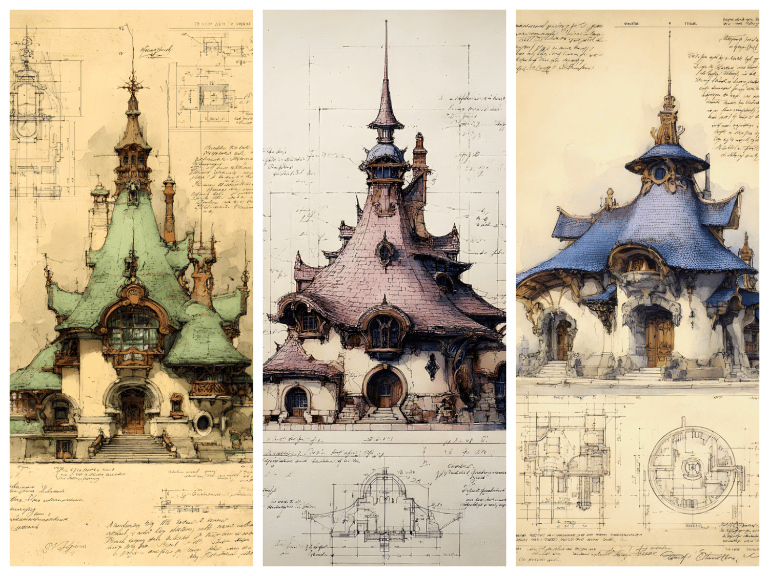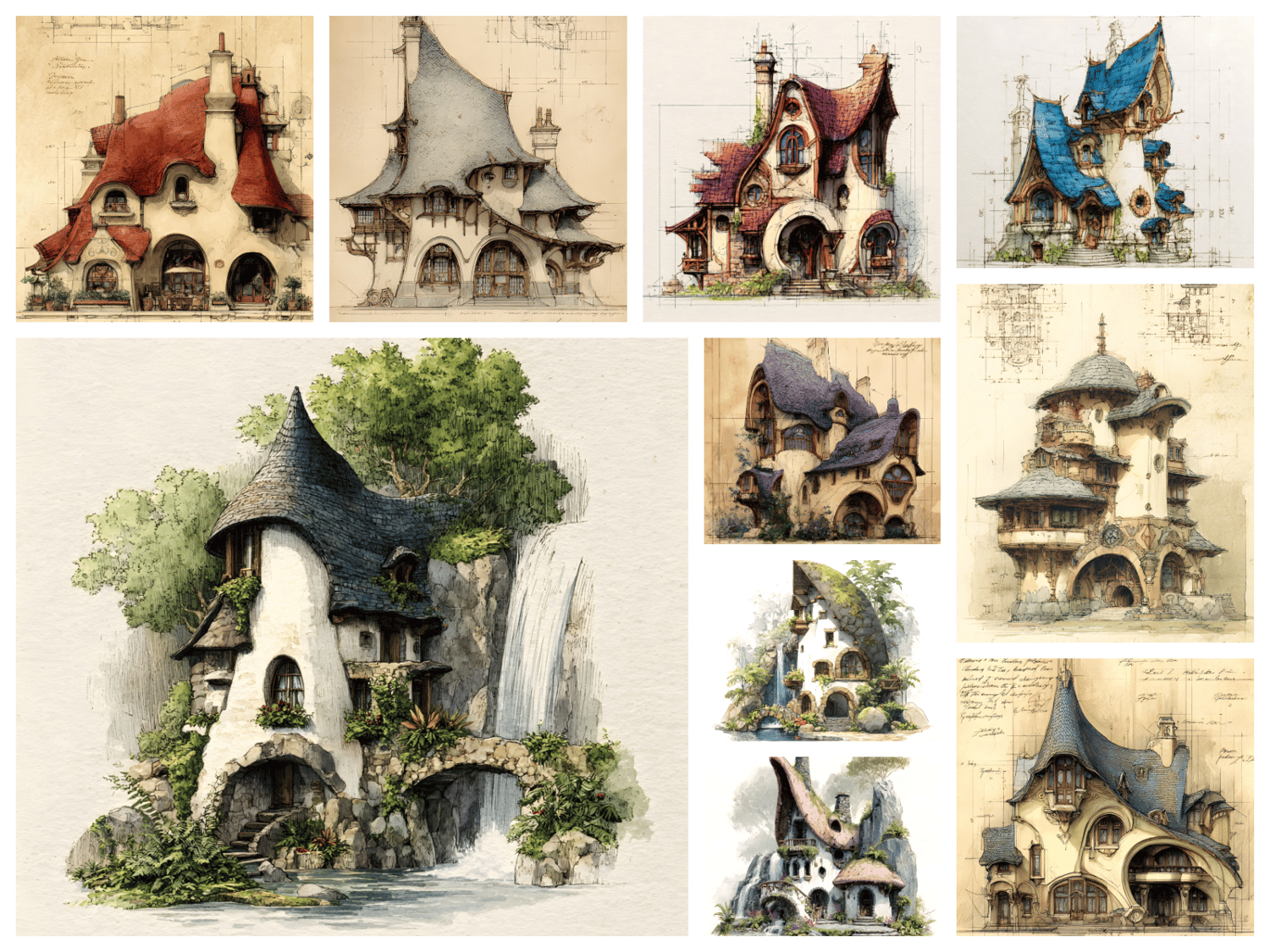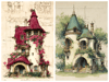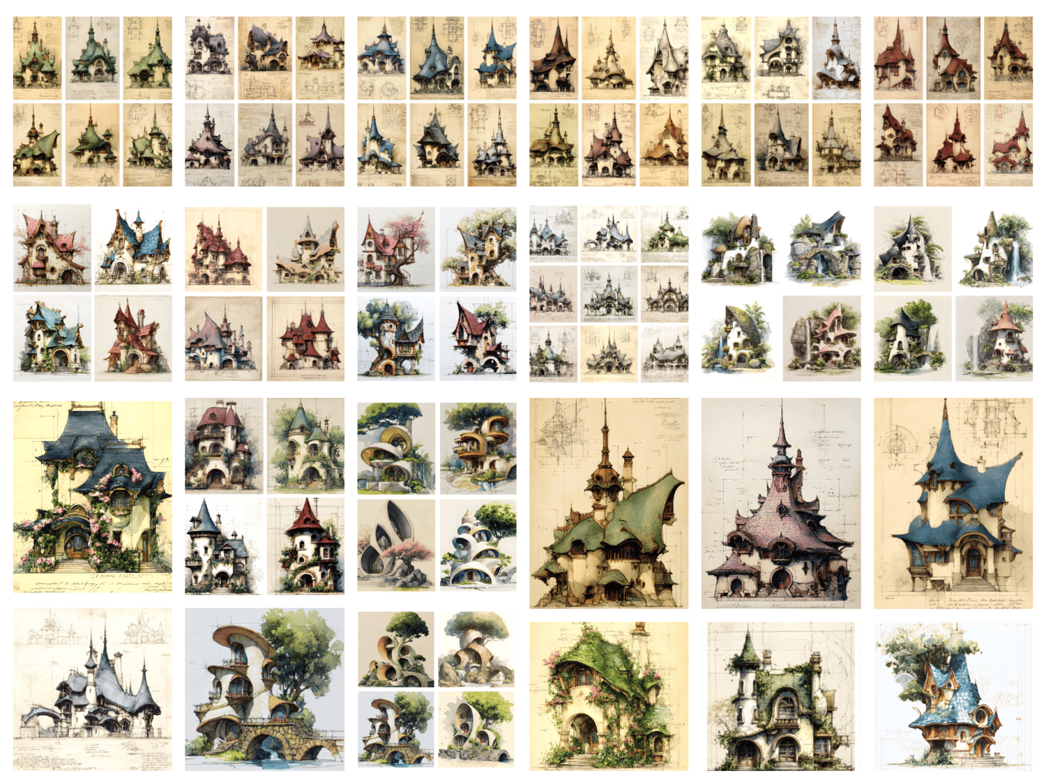 261 AI-generated digital art prints – 15 bundles of the ultimate fantasy architecture collection featuring green, purple, blue, sepia, gray, and burgundy colorways, royal palaces, towered and ivy-covered manors, fairy houses, treehouses, shell houses, and more. High resolution 300 DPI, 9x16, 8:10, and 1:1 formats, instant download. No physical product. Commercial license included.