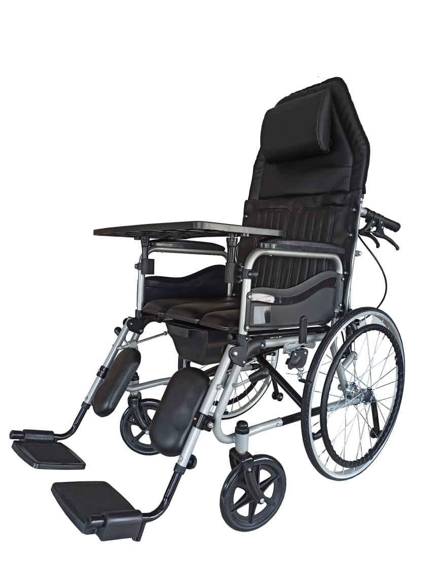 Karma Ryder 8 Reclining Wheelchair with Commode | Foldable Hydraulic Recliner Chair with U-Cut Seat, 3D Headrest, Tray & Detachable Armrests | Ideal for Elderly & Patients