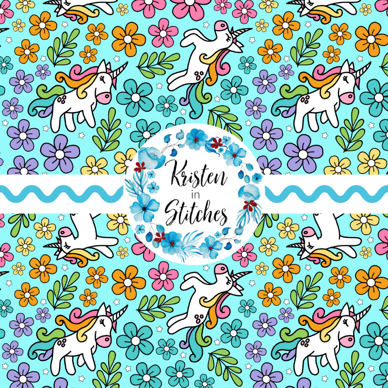 Sweet unicorns with rainbow manes and colorful daisy flowers on blue.