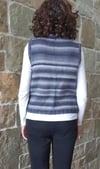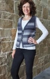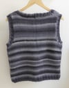 Lady’s stocking stitch vest with 2x2 rib bands, in two styles. Style A has a deep, round neck. Style B is a front opening, V neck style with three buttons.