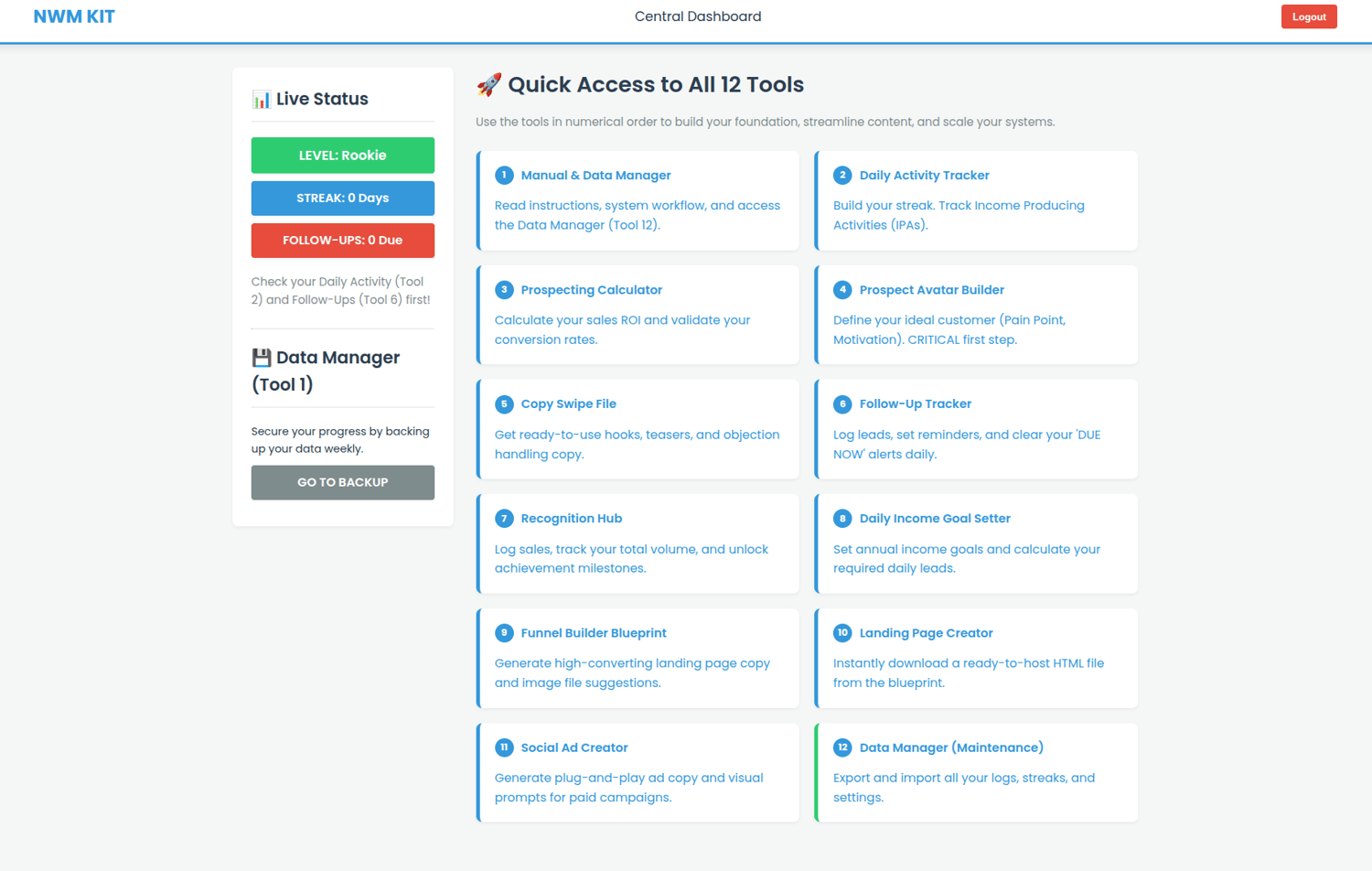 Stop guessing and start scaling. The Online Network Marketing Starter Kit V2 (NWM Starter Kit) is the complete, self-hosted, browser-based suite of 12 integrated tools designed specifically to help Network Marketers, MLM professionals, and digital sellers manage their entire business workflow, from prospecting and tracking to generating high-converting funnels and ad copy.