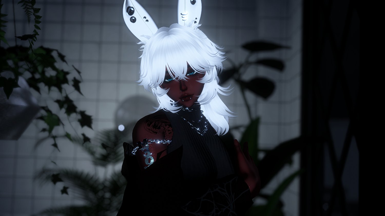 Acc: Fishnets, Glasses, Arm Wraps, Neck Chain, Leg Wrap, Bracelets, Thigh Fishnet Stockings. Arm Chains,Harness, ZZZ, Bunny Mask, Bunny Mouth Keychain, Bracelet, Goth Bunny Ears, ninja stars