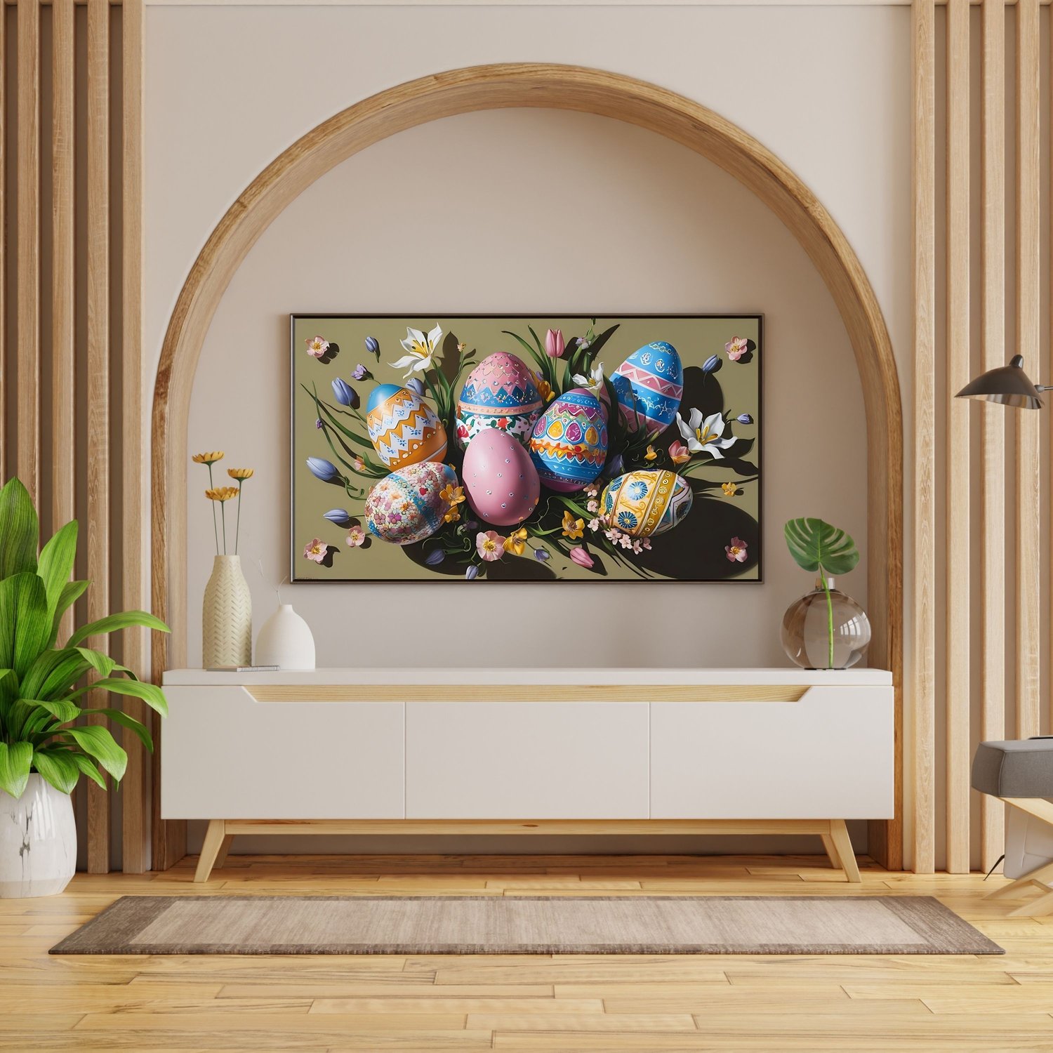 Celebrate the season with this Easter Frame TV Art—a vibrant fusion of whimsical bunnies, sleek modern eggs, and soft spring hues! This digital artwork features a cheerful Easter bunny nestled among abstract pastel eggs, set against a clean, minimalist backdrop. Perfect for Samsung Frame TVs, tablets, or screens, it’s a fresh, contemporary twist on classic Easter charm that delights kids and adults alike!